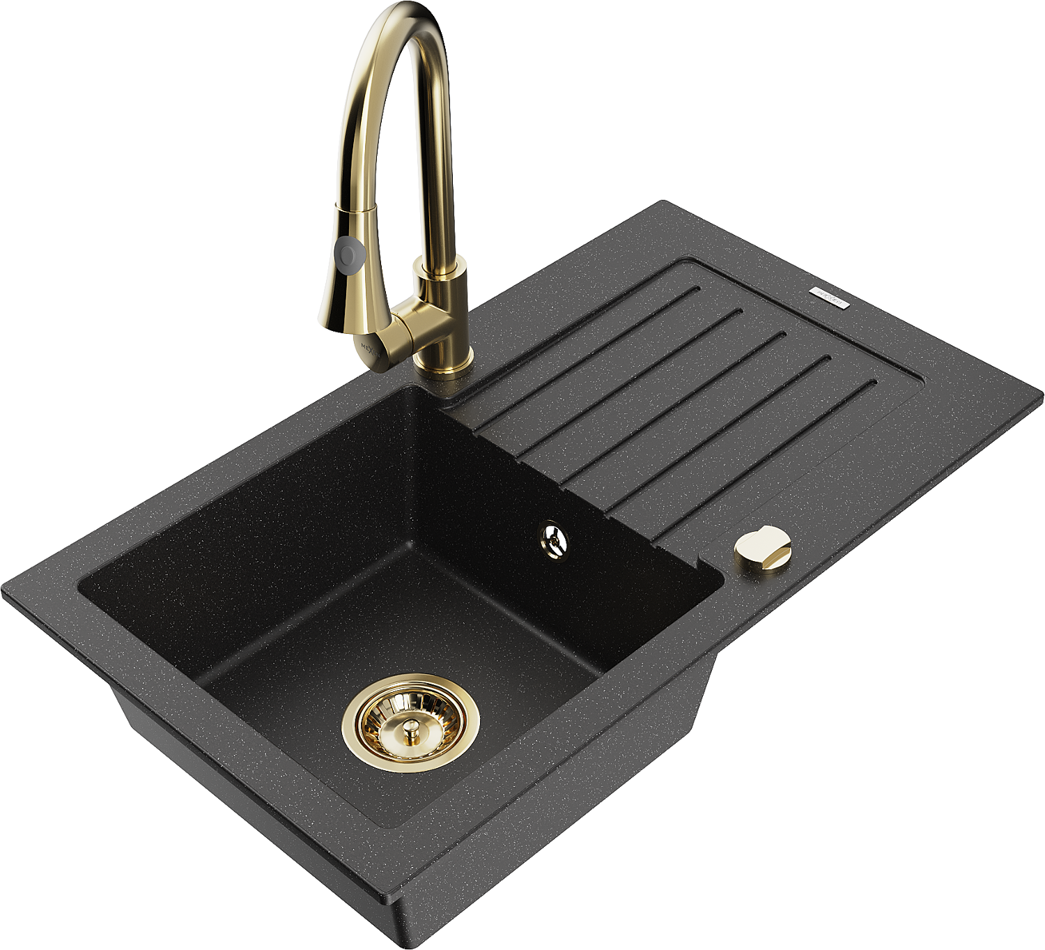 Mexen Pablo granito plautuvė su vienu dubeniu ir nusausintuvu bei virtuvine maišytuvu Elia, juodos/sidabrinė metalik