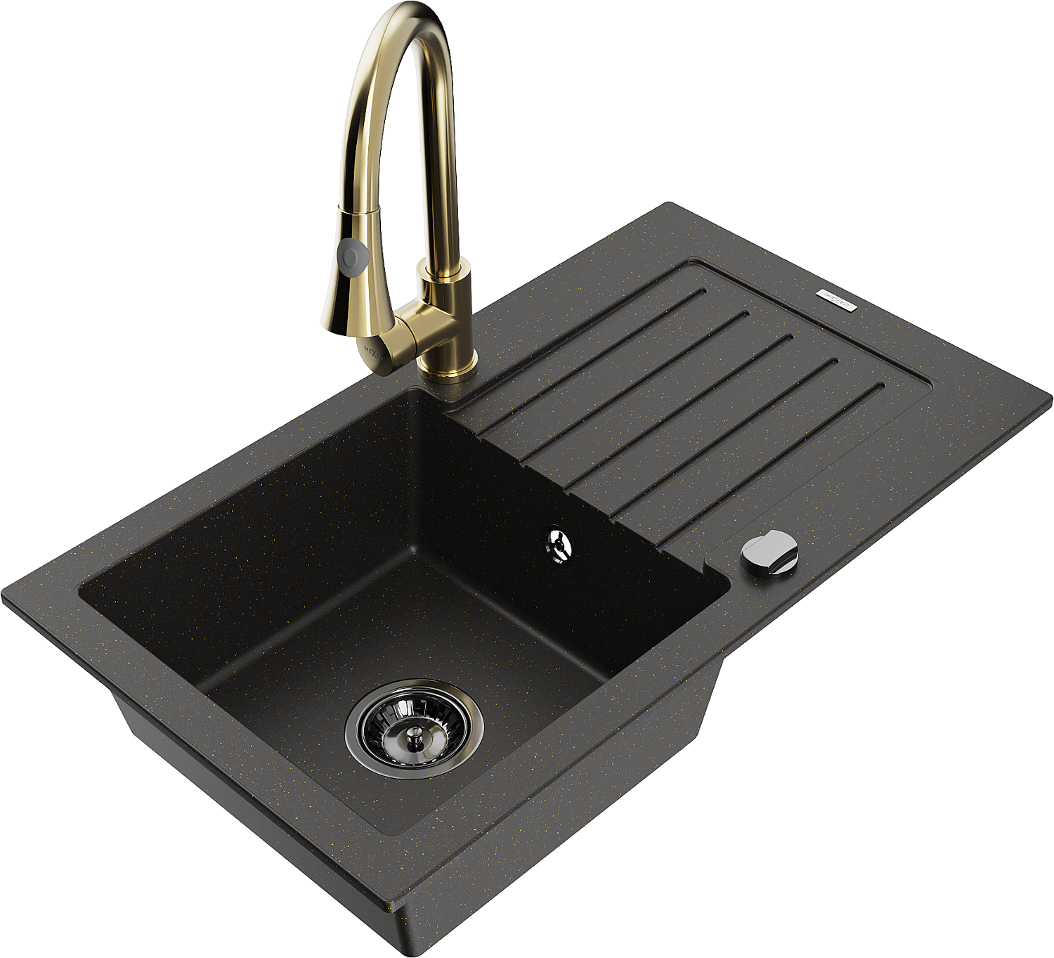 Mexen Pablo granitinė virtuvės kriauklė su viena kamera, nusausėjimo paviršiumi ir Elia virtuvės maišytuvu, juoda/auksinė metal?