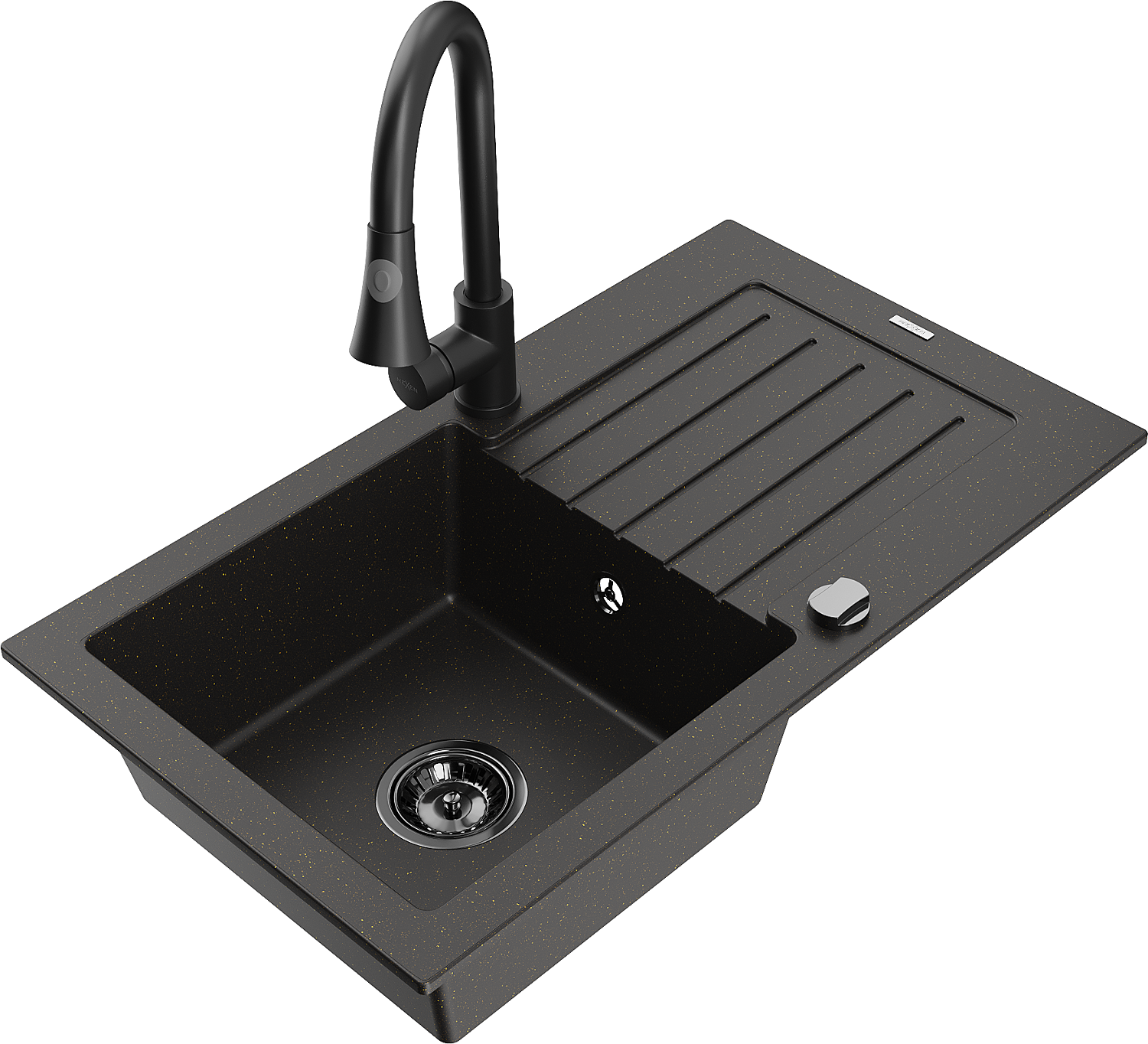 Mexen Pablo granitinė vienos kameros plautuvė su nuvarvėjimo lentyna ir virtuviniu maišytuvu Elia, juodas/auksinis metalikas