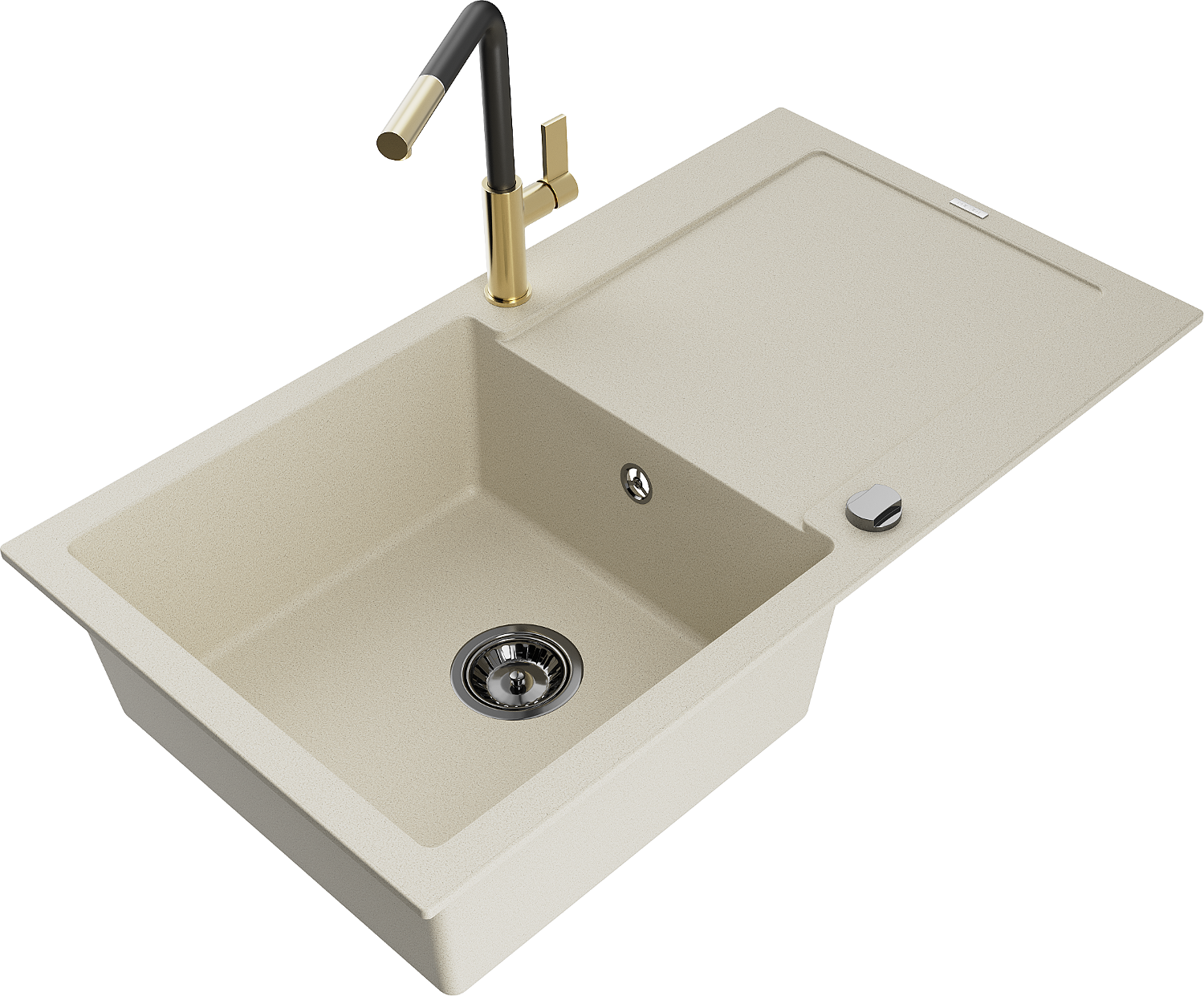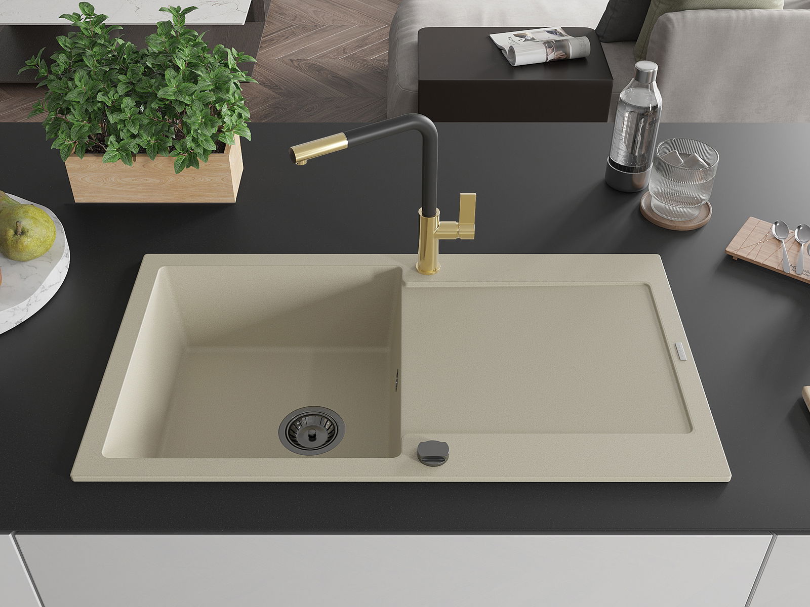 Mexen Leo granitinė vienos kameros plautuvė su nutekamuoju paviršiumi ir Flora virtuviniu čiaupu, smėlio spalvos