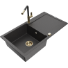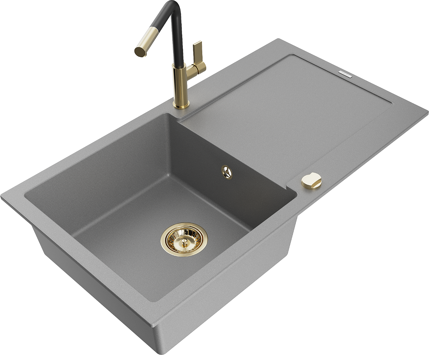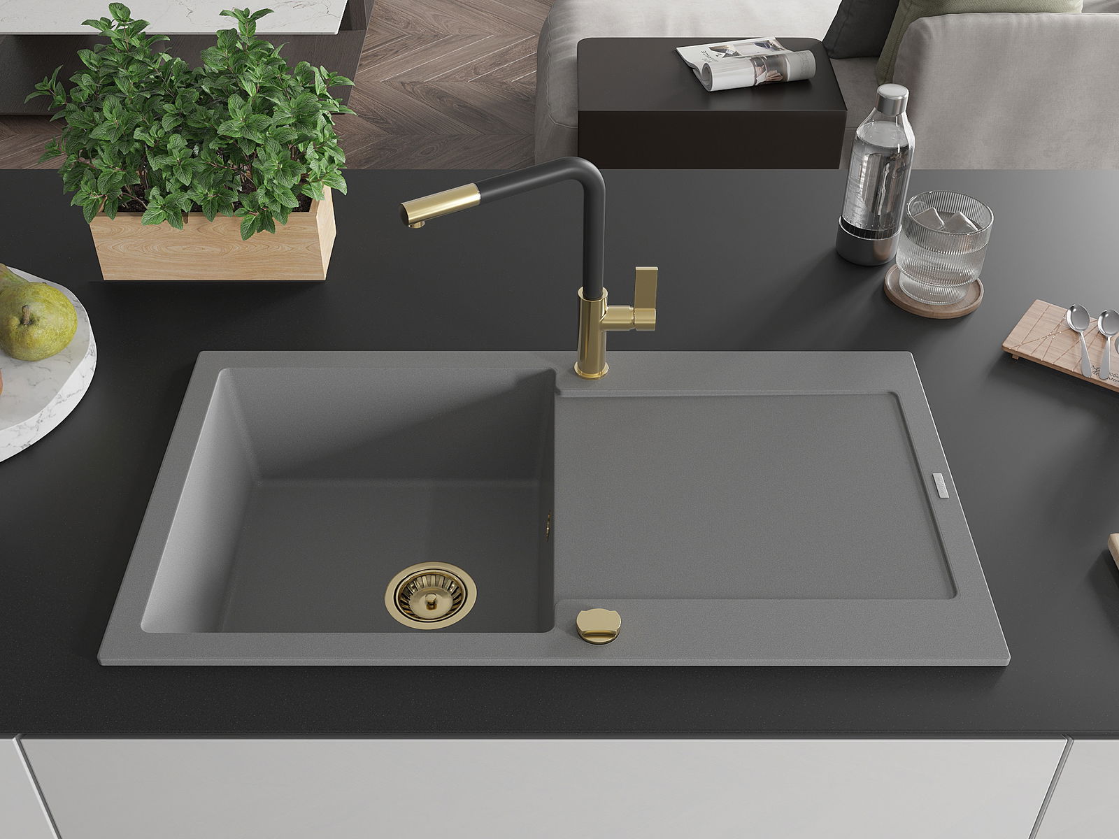 Mexen Leo granito vienos dubenėlės kriauklė su nusausintuvu ir virtuviniu maišytuvu Flora, pilka - 6501-71-670401-57-G