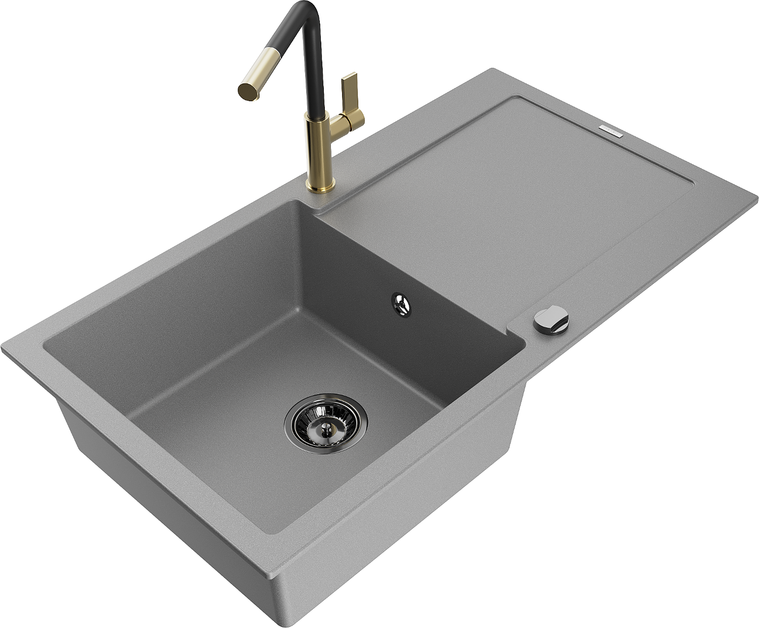 Mexen Leo granitinė vienos kamerų kriauklė su nuvarveju ir Flora virtuviniu maišytuvu, pilka - 6501-71-670401-57-B