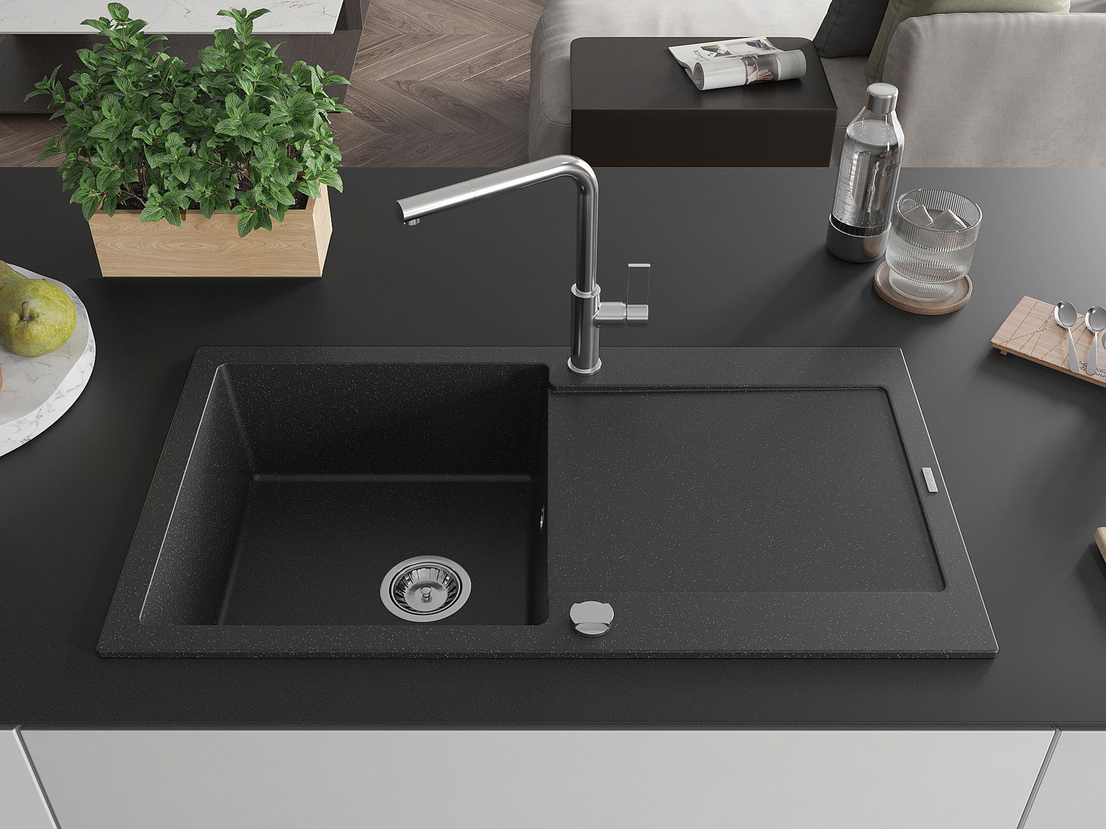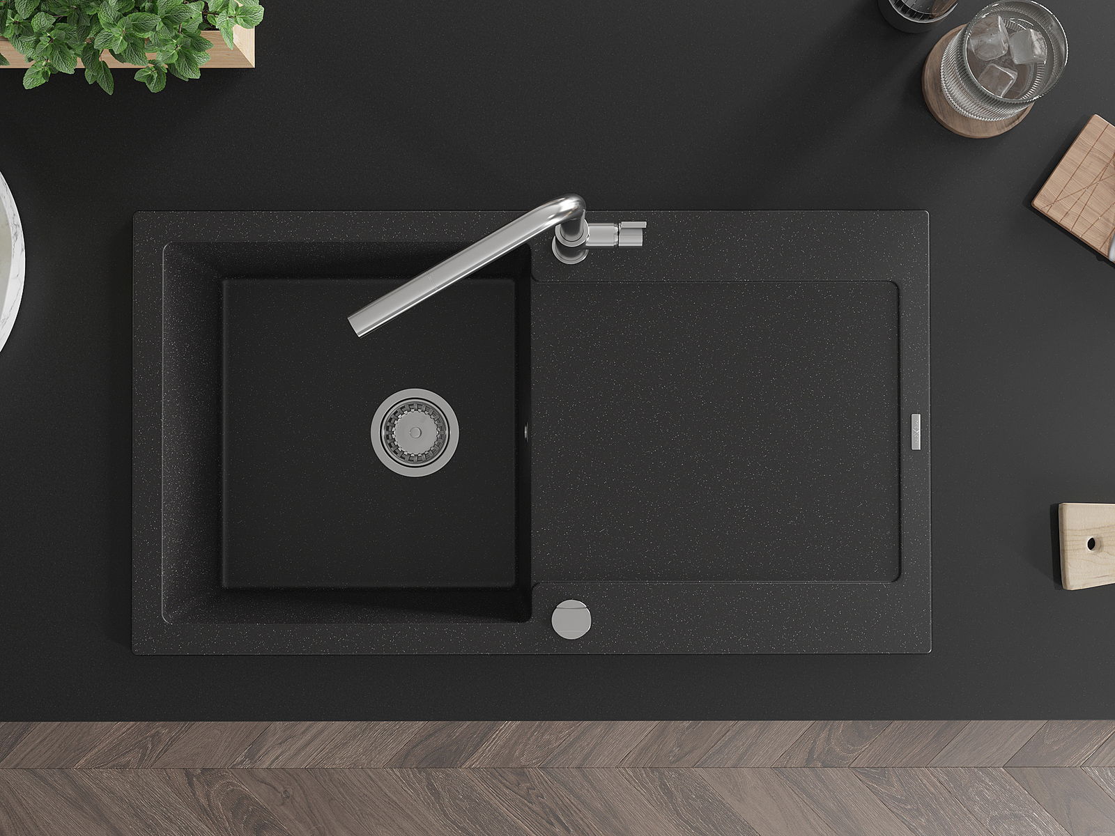 Mexen Leo granitinė vienos kameros kriauklė su nusausintuvu ir virtuviniu maišytuvu Flora, juodas/sidabrinis metalikas