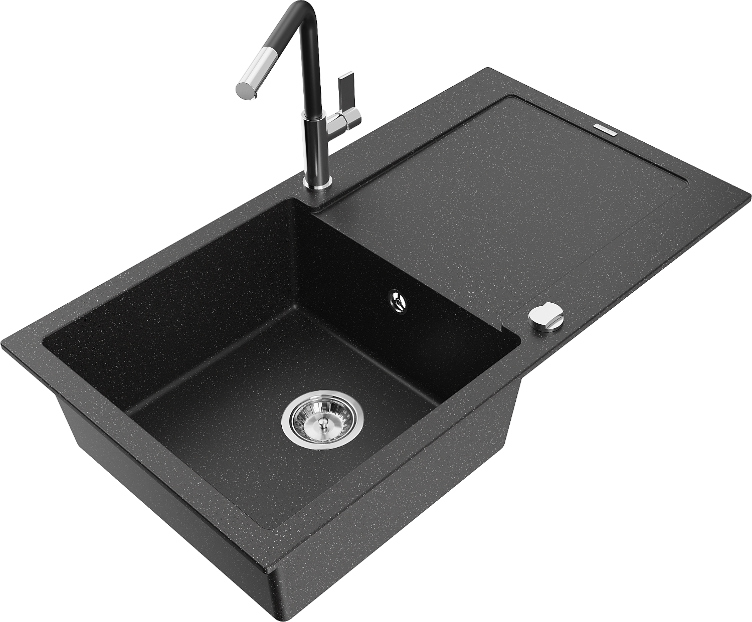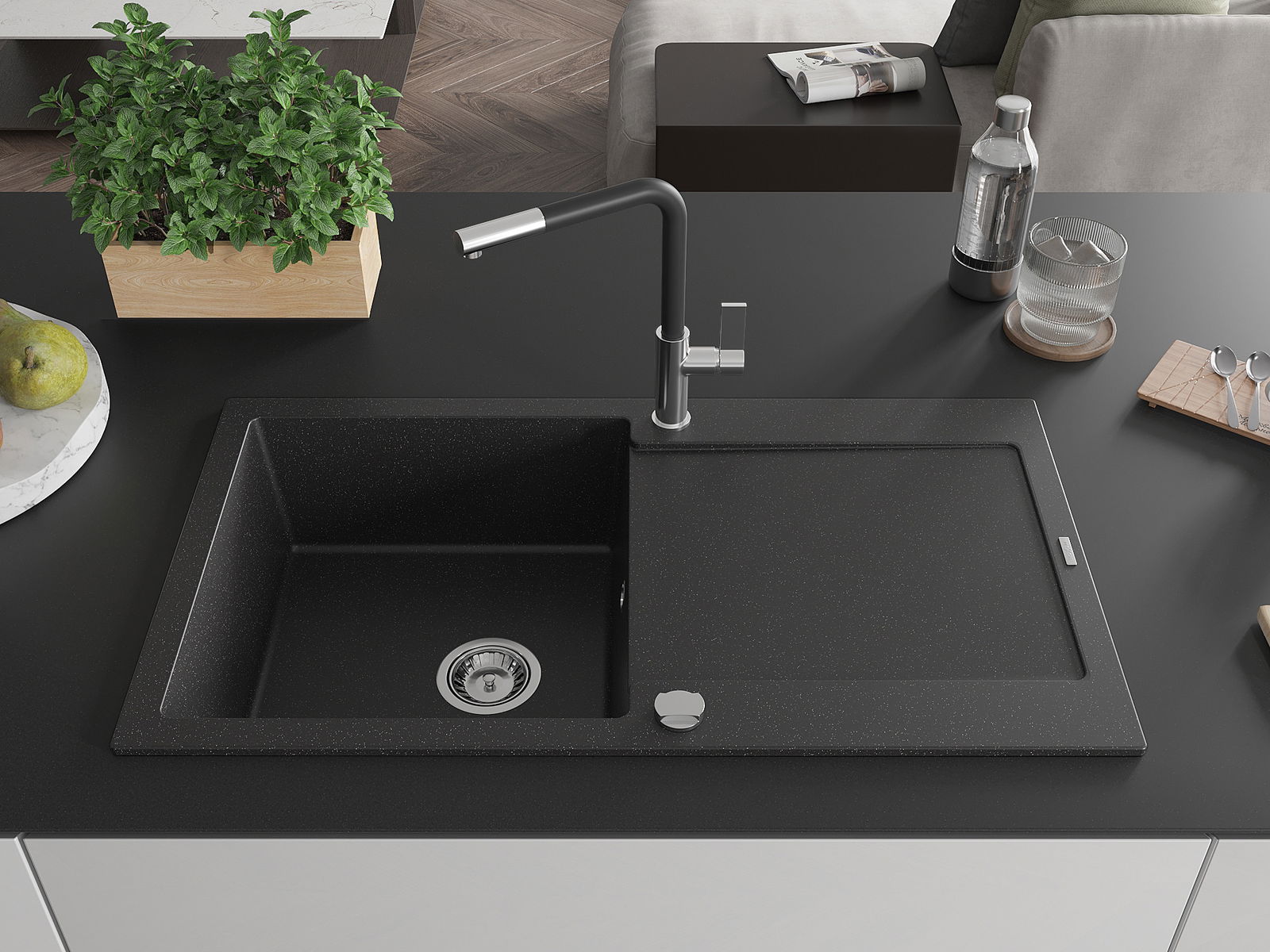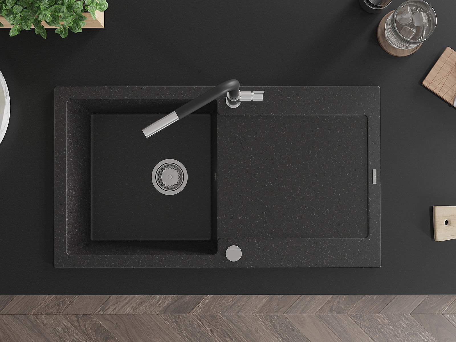 Mexen Leo 1 skyriumių granito plautuvė su nutekėjimo skyriumi ir virtuviniu maišytuvu Flora, juoda/sidabro metalo spalvos