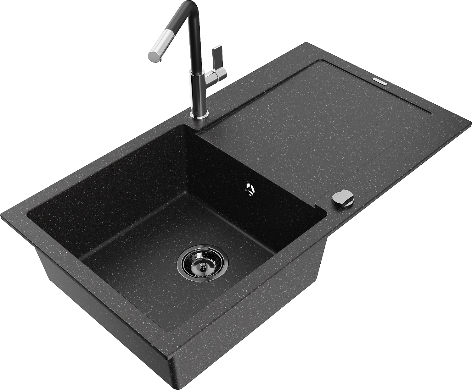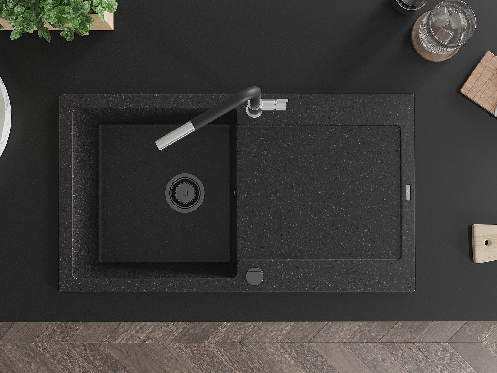 Mexen Leo granitinė vienos plautuvės kriauklė su nutekamu ir Flora virtuviniu maišytuvu, juoda/sidabrinis metalikas