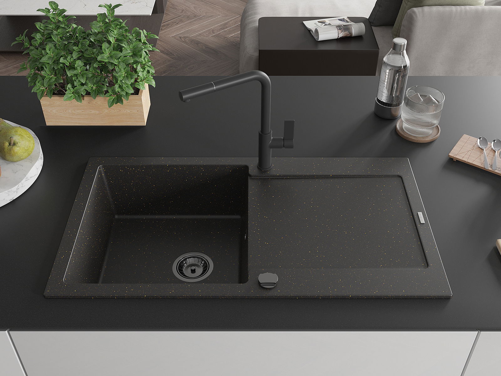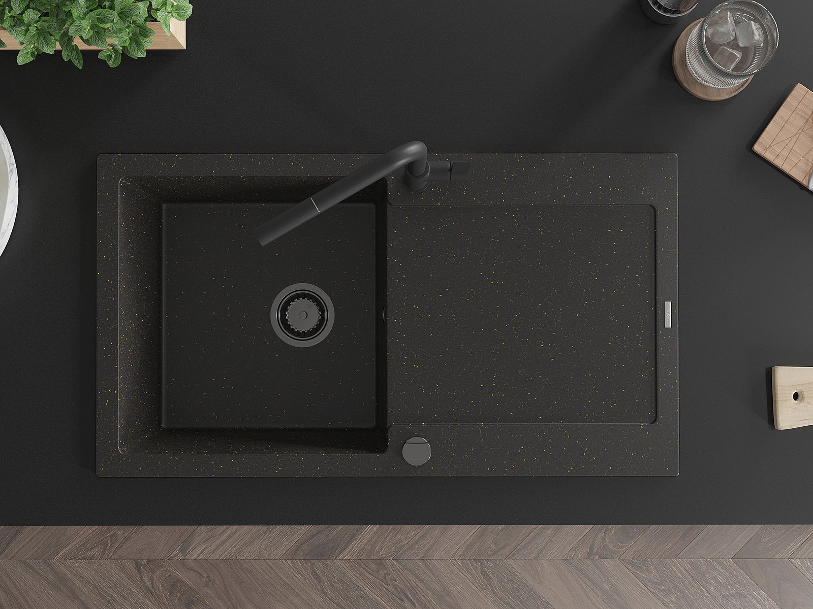 Mexen Leo granito plautuvė 1 skyrius su nutekamu ir virtuviniu maišytuvu Flora, juoda/auksinė metalik - 6501-75-670401-70-B