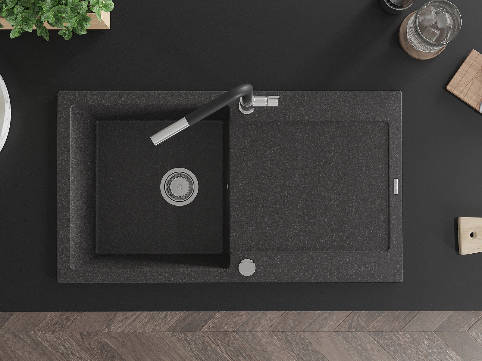 Mexen Leo granitinis plautuvė 1-skyrius su nutekėjimu ir Flora virtuviniu maišytuvu, juoda su taškeliais - 6501-76-670401-07