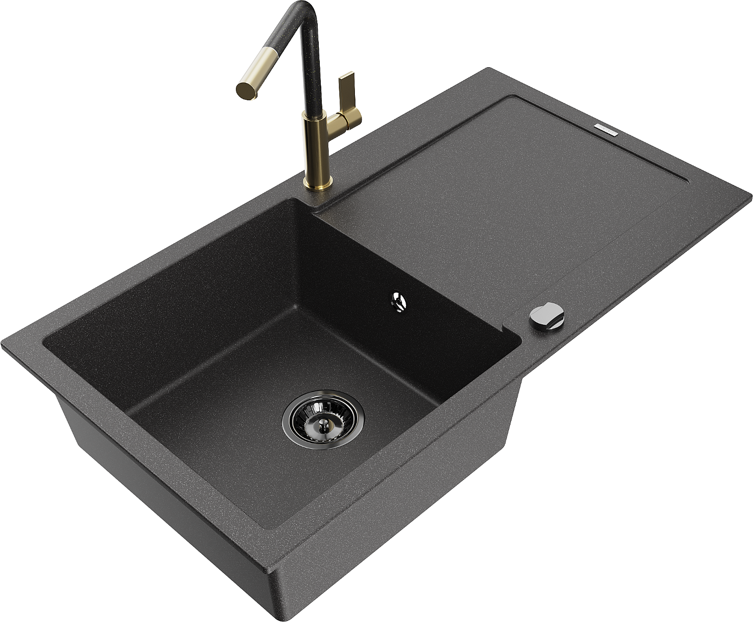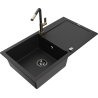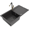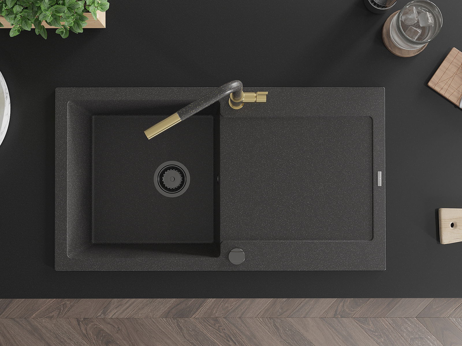 Mexen Leo vienos plautuvės granito kriauklė su nusausinimo vieta ir virtuviniu maišytuvu Flora, juoda su dėmelėmis