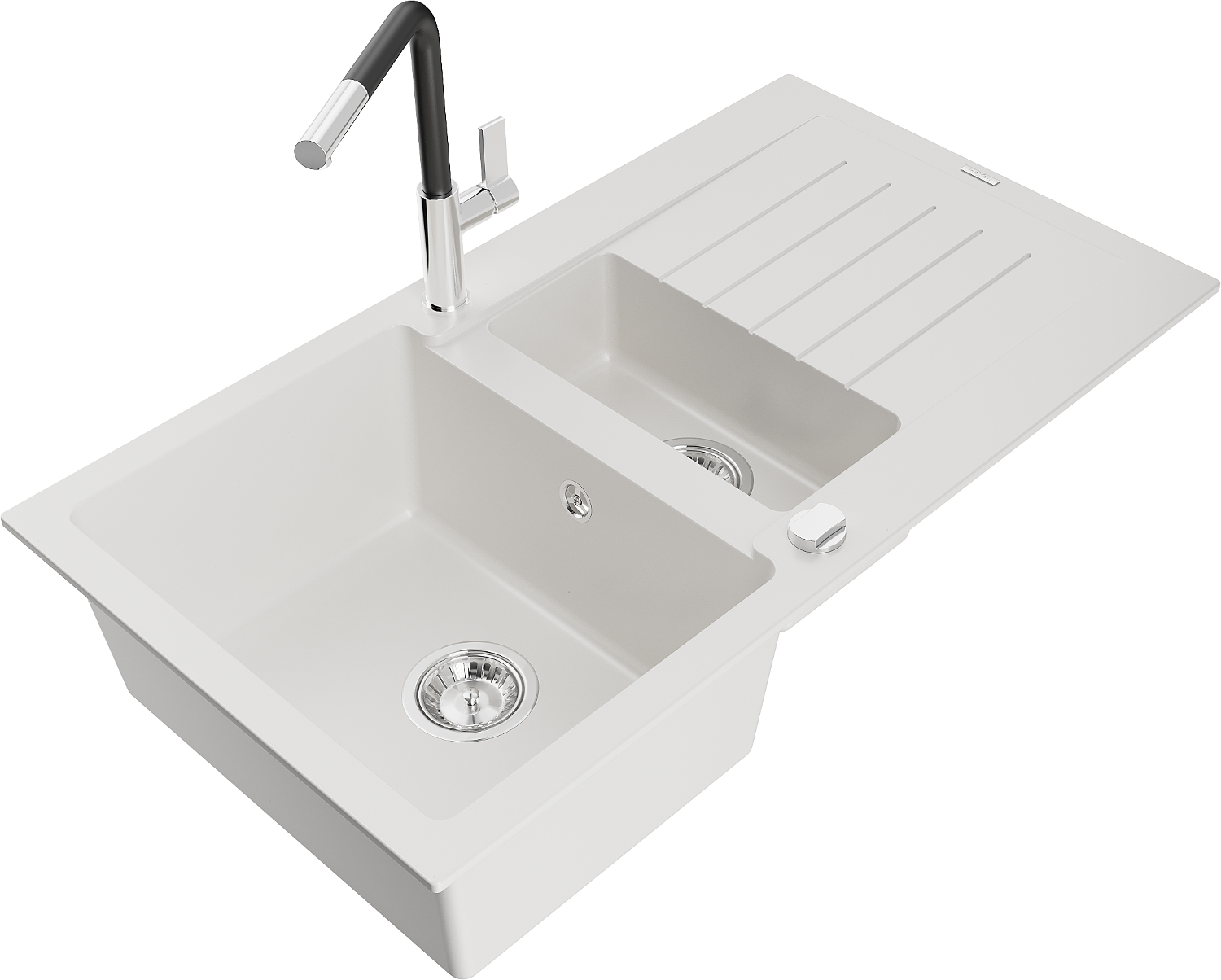 Mexen Matias granitinė 1,5 kamerų plautuvė su drenažu ir Flora virtuviniu maišytuvu, balta - 6502-20-670401-07