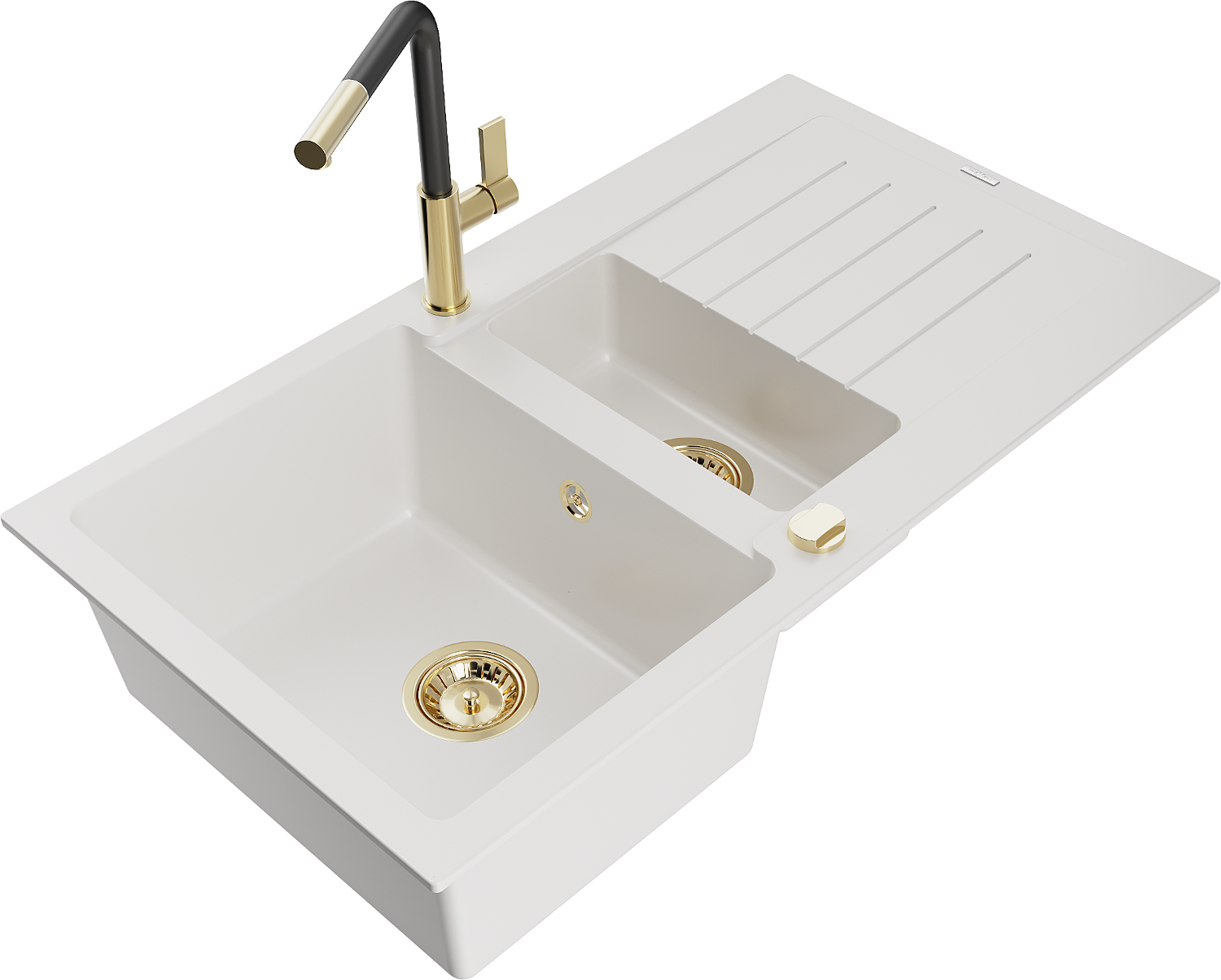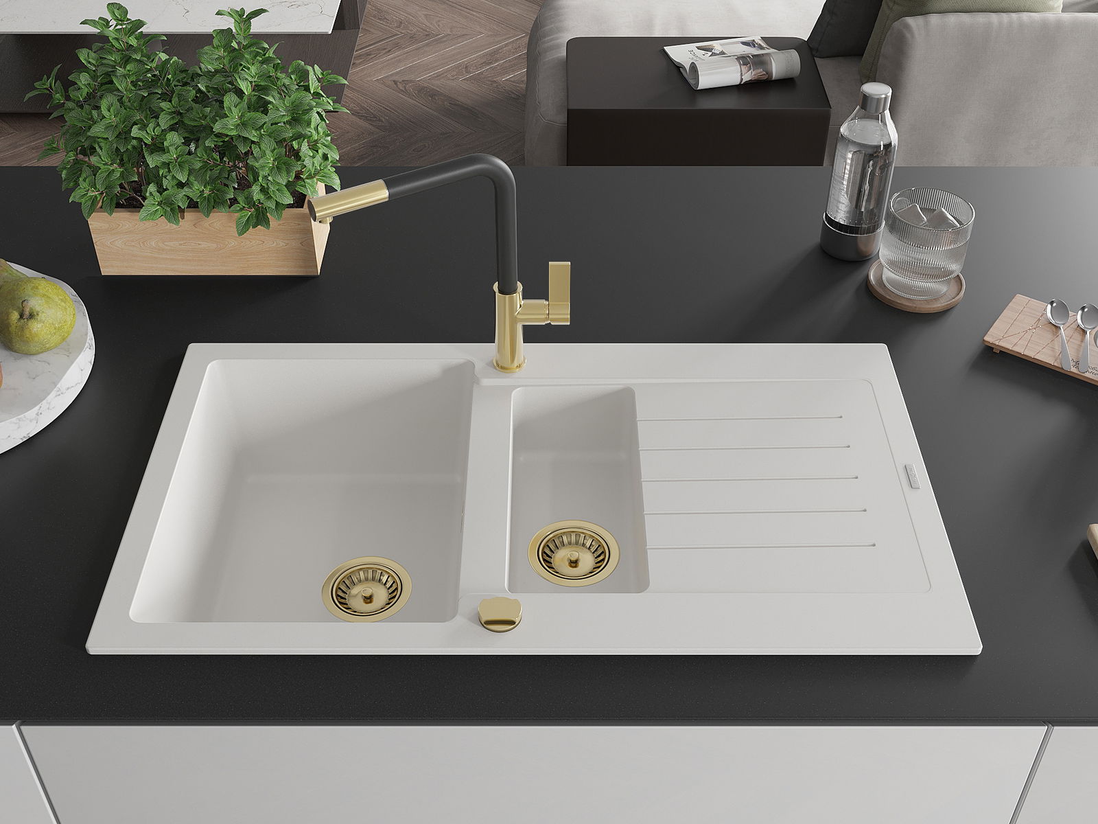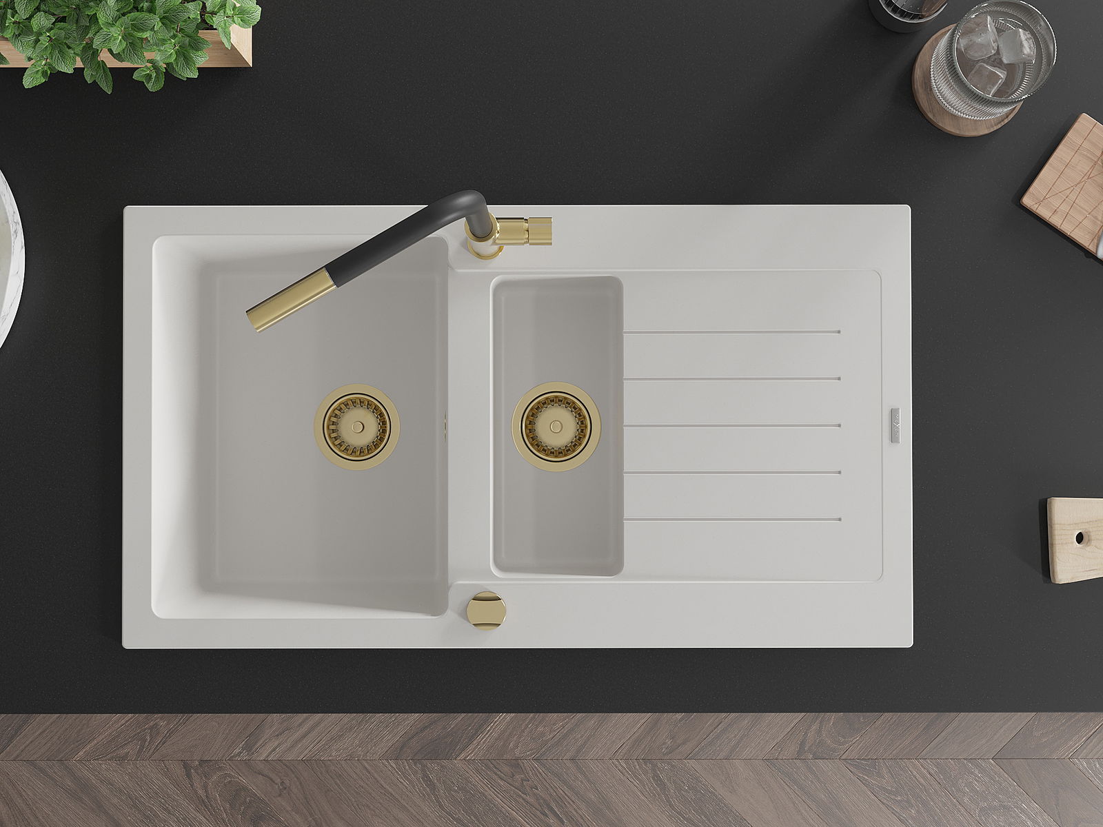 Mexen Matias granitinė 1,5 skyrių kriauklė su nutekėjimu ir Flora virtuvės maišytuvu, balta - 6502-20-670401-57-G