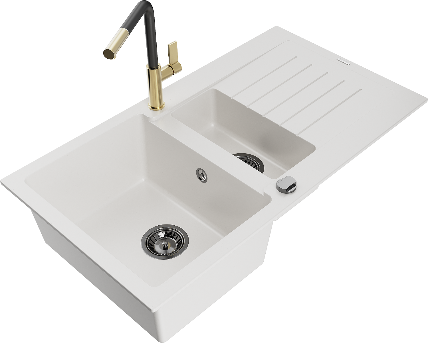 Mexen Matias granito plautuvė 1,5 kamerų su nutekėjimu ir virtuvės čiaupu Flora, balta - 6502-20-670401-57-B