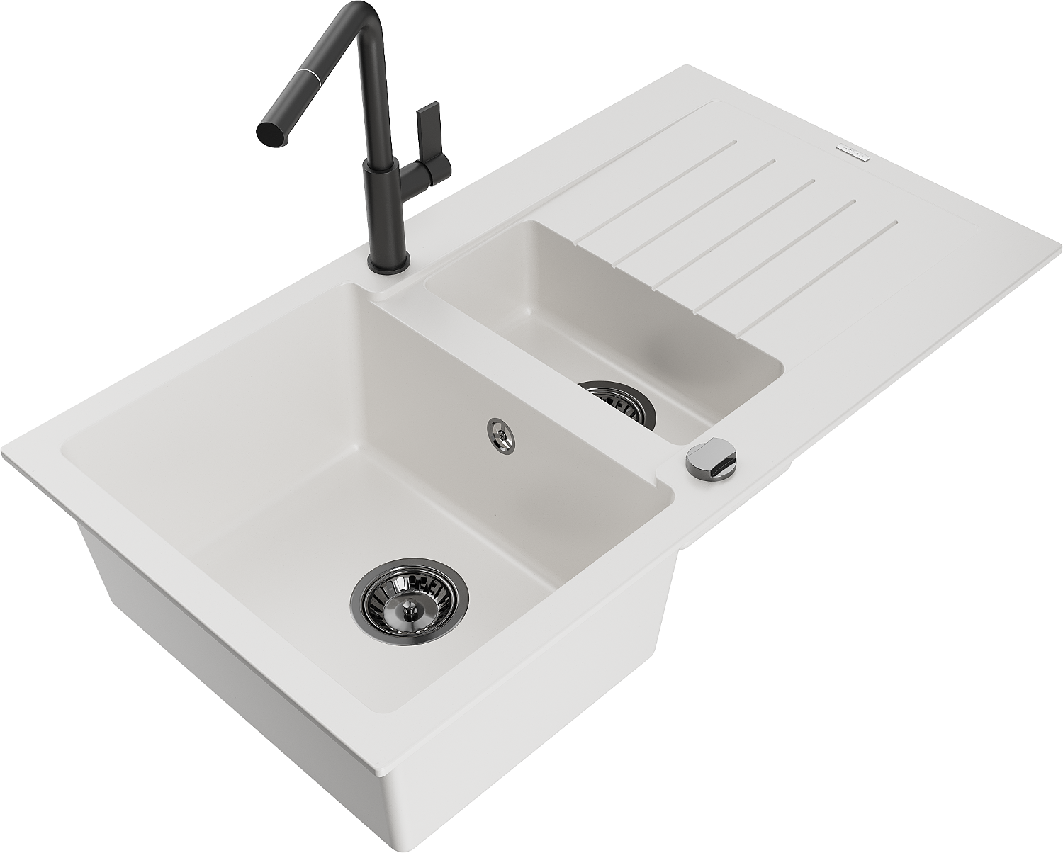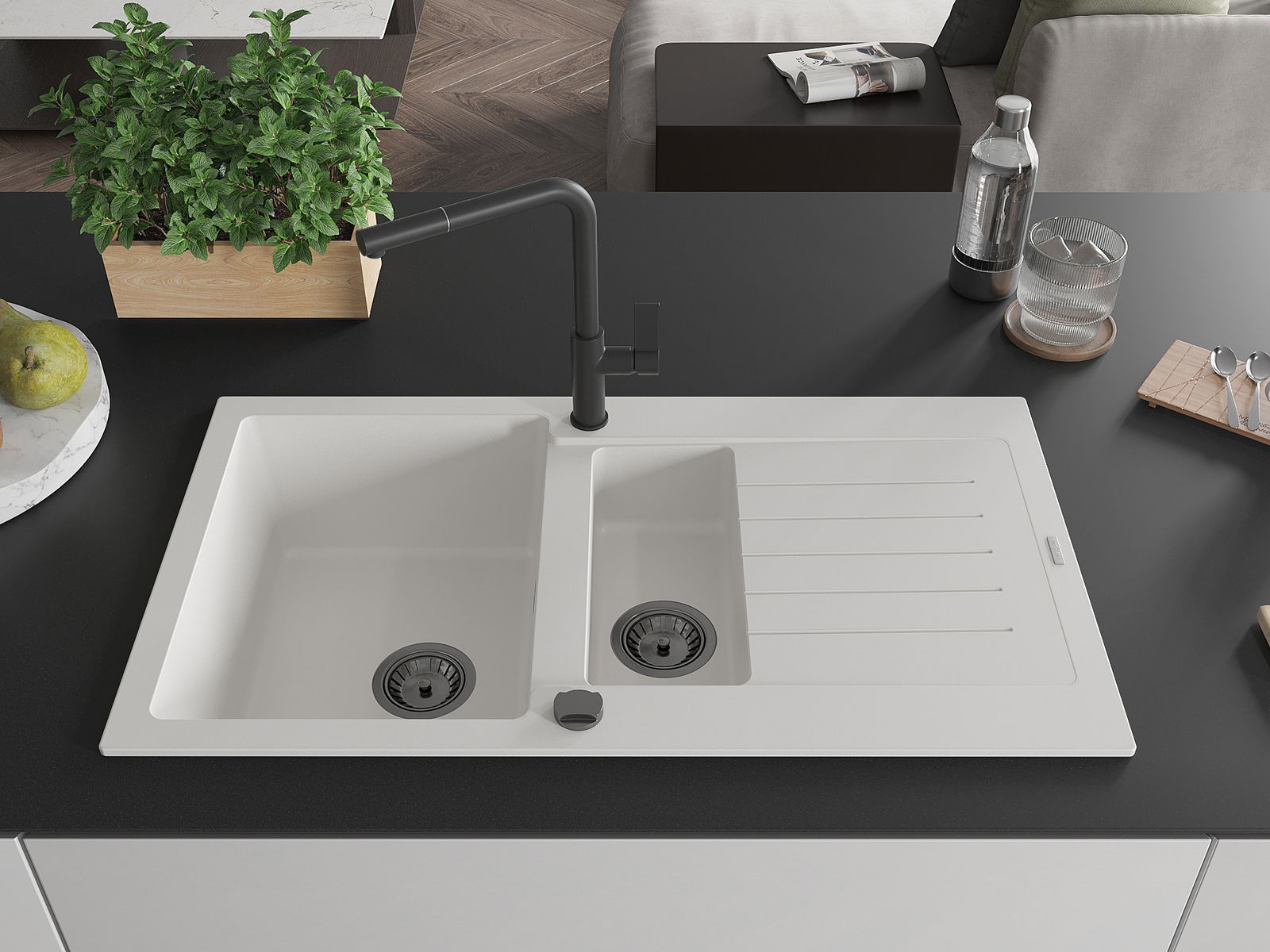 Mexen Matias granitinė kriauklė 1,5 skylių su lašėjimu ir Flora virtuviniu maišytuvu, balta - 6502-20-670401-70-B