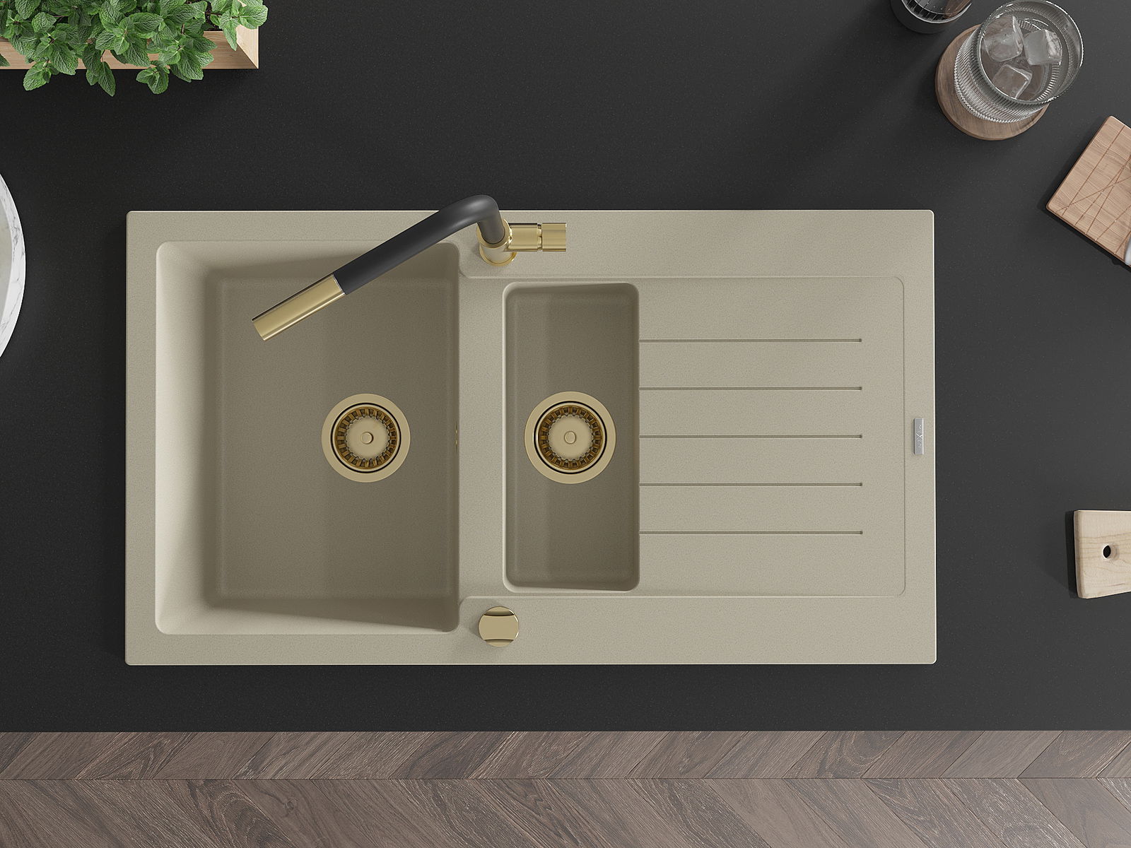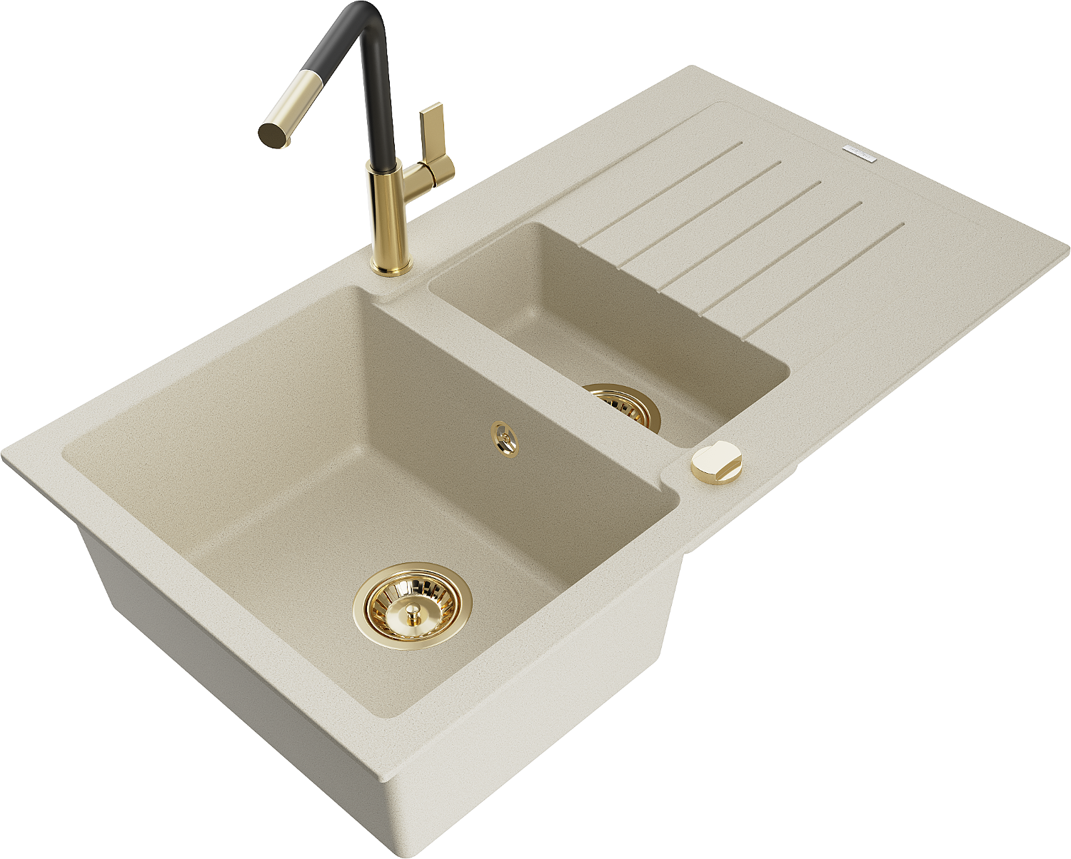 Mexen Matias 1,5 sekcijų granito kriauklė su stalčiumi ir Flora virtuviniu maišytuvu, smėlinė - 6502-69-670401-57-G