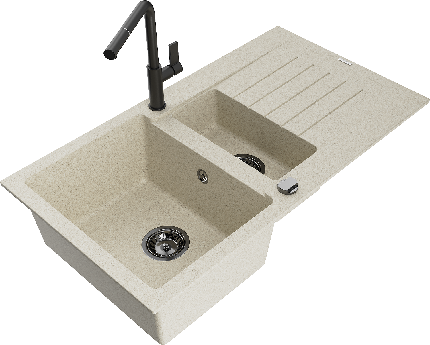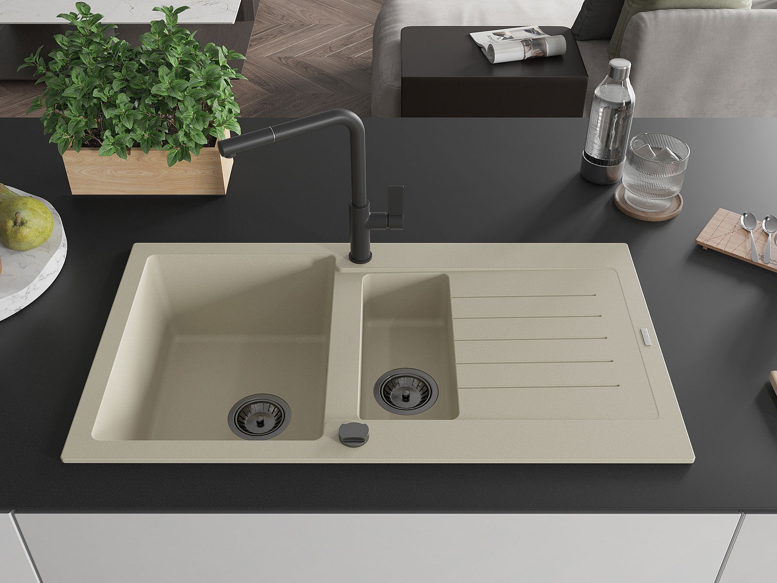 Mexen Matias granitinė 1,5 kamerų kriauklė su nutekėjimu ir Flora virtuviniu maišytuvu, smėlio spalvos