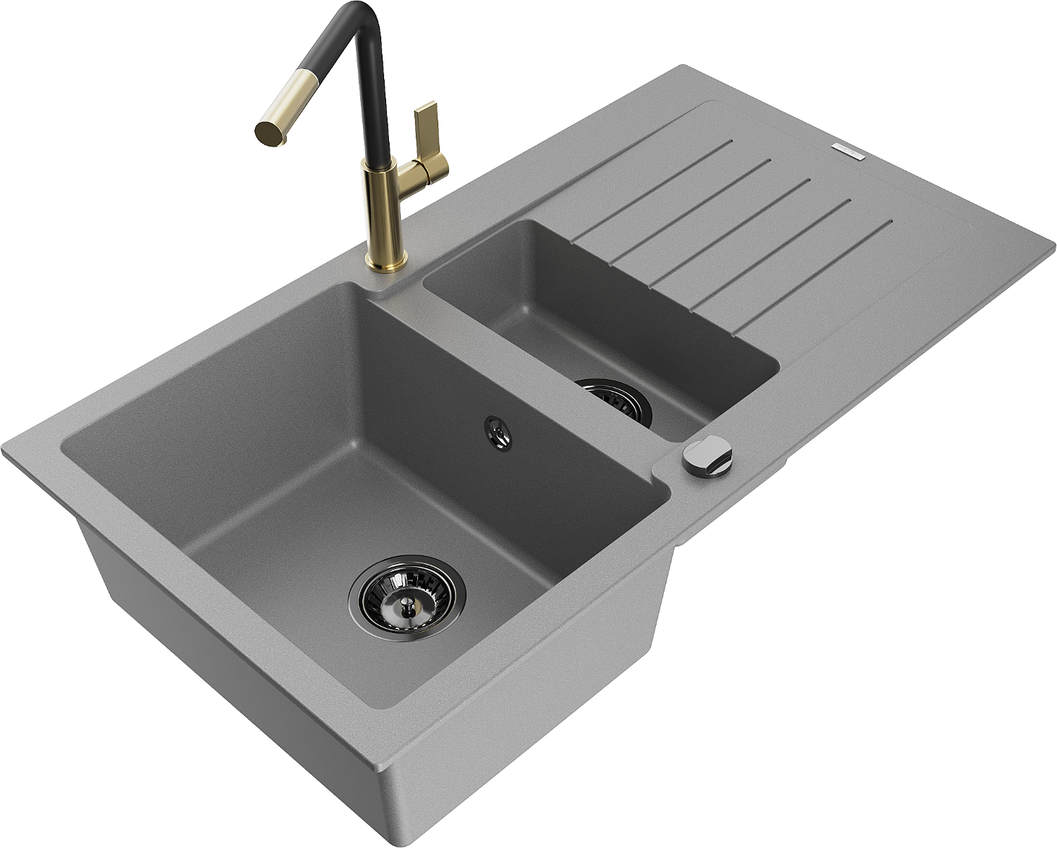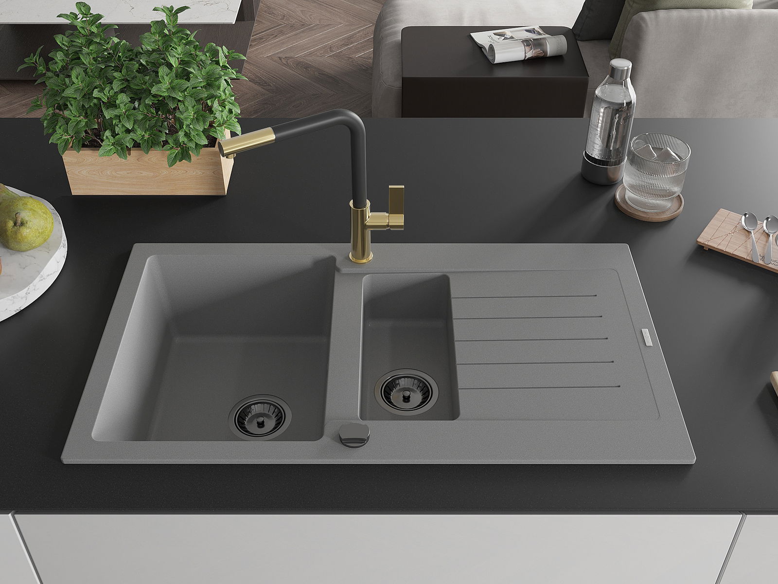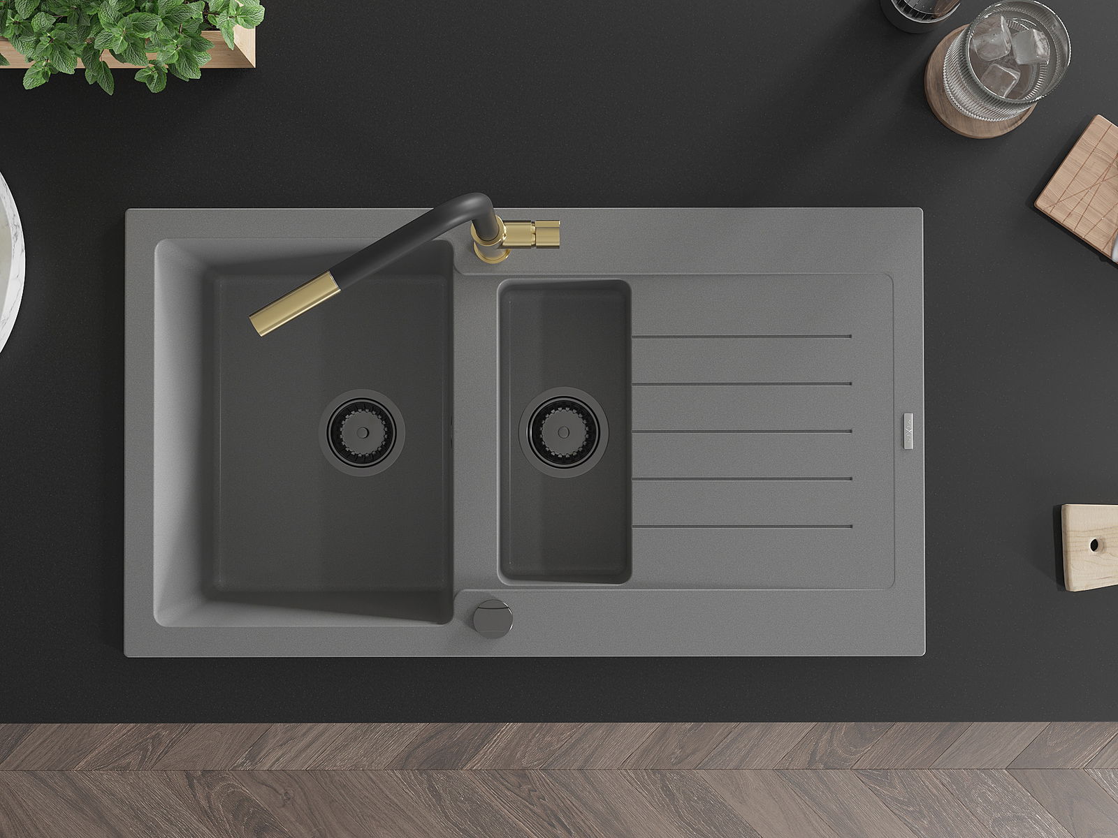Mexen Matias granitinė 1,5 skyrių kriauklė su nubėgimu ir virtuviniu maišytuvu Flora, pilka - 6502-71-670401-57-B