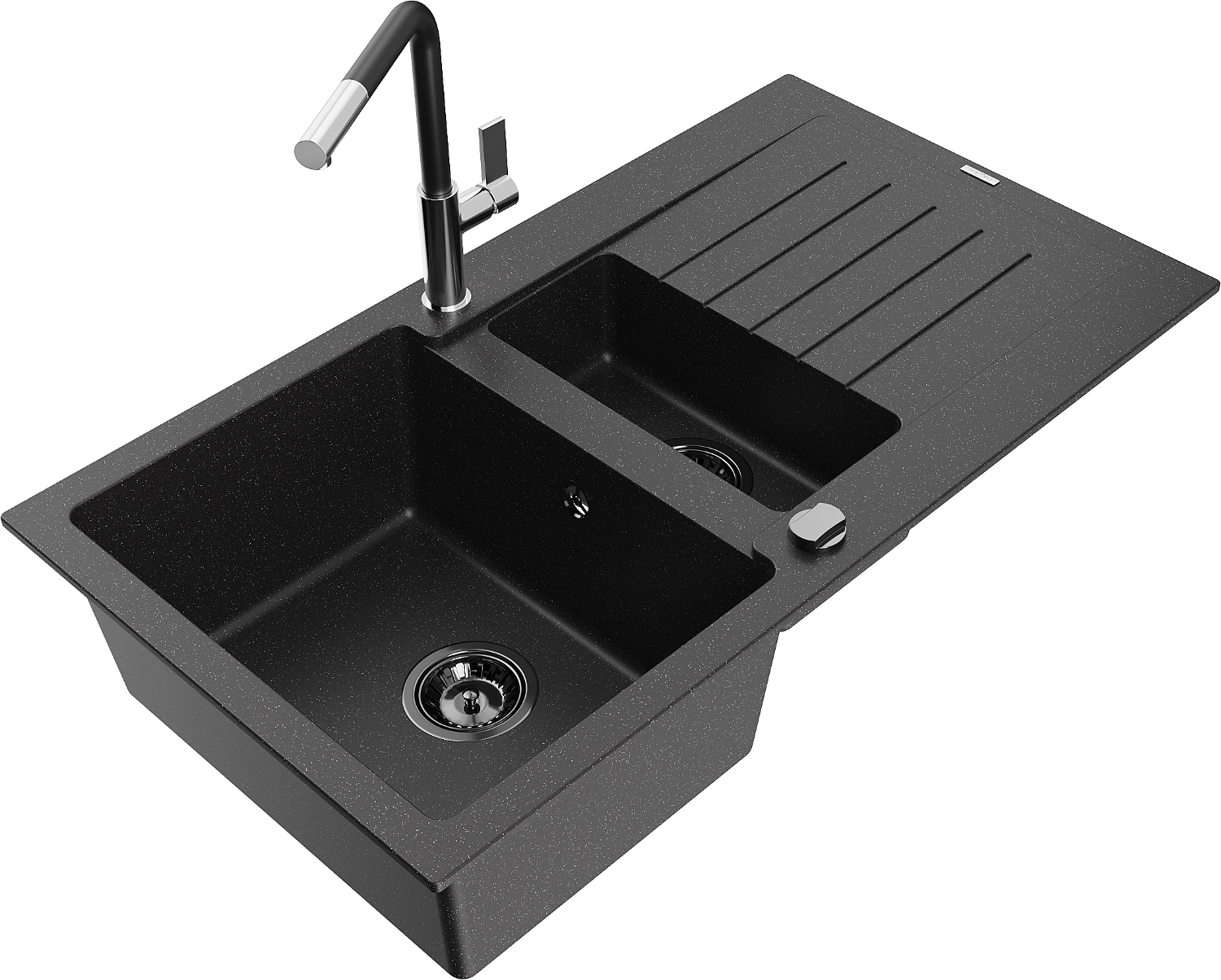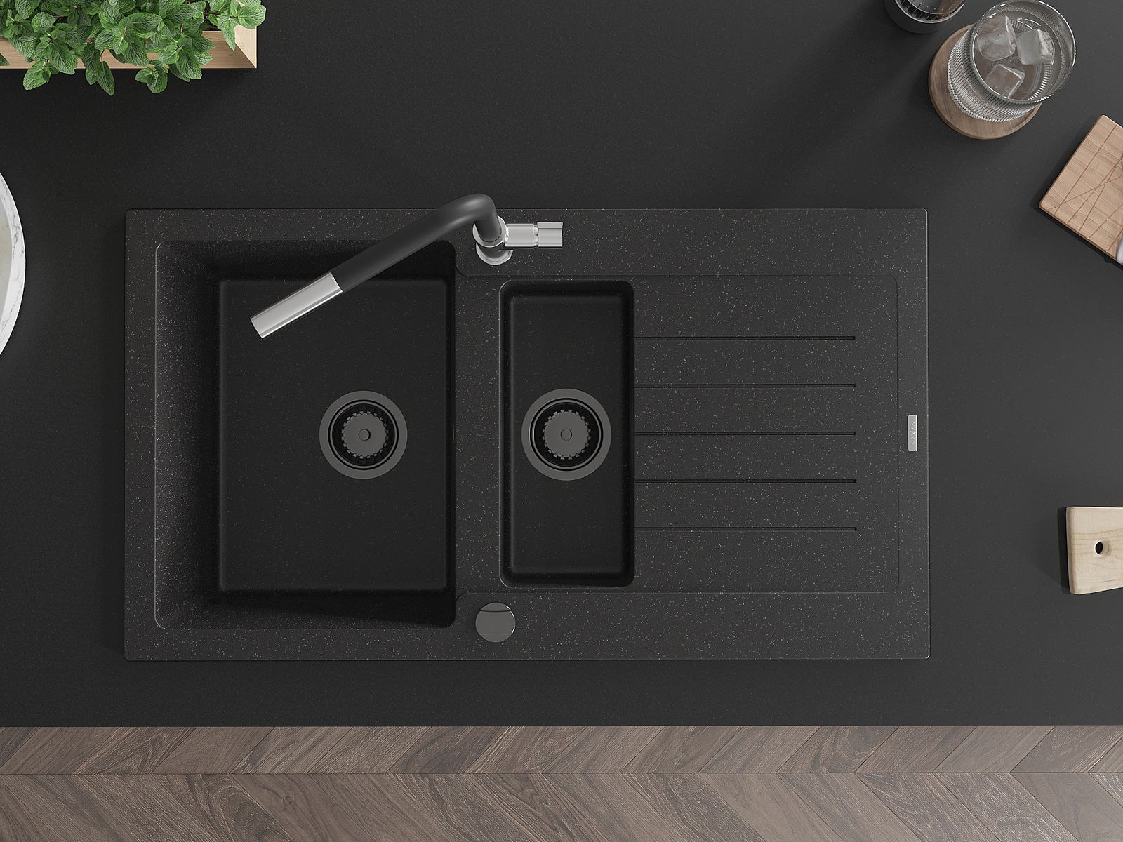 Mexen Matias 1,5 skyrių granitinė plautuvė su nuvarvėjimo zona ir Flora virtuvės maišytuvu, juoda/sidabrinė