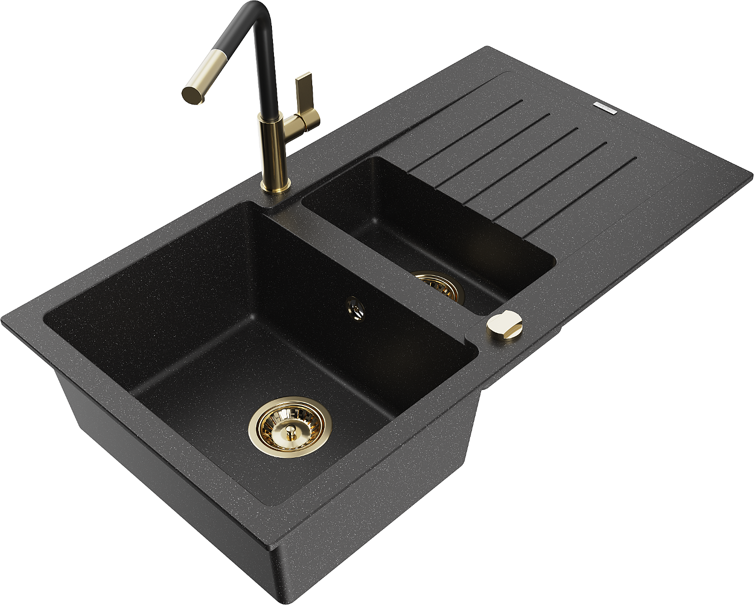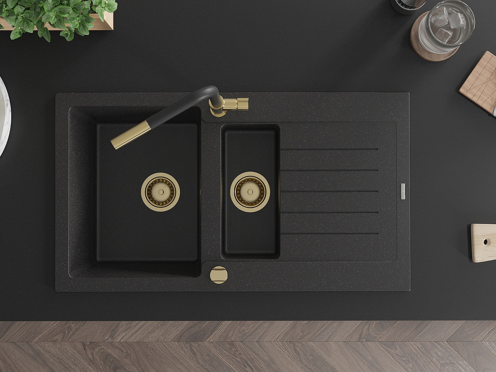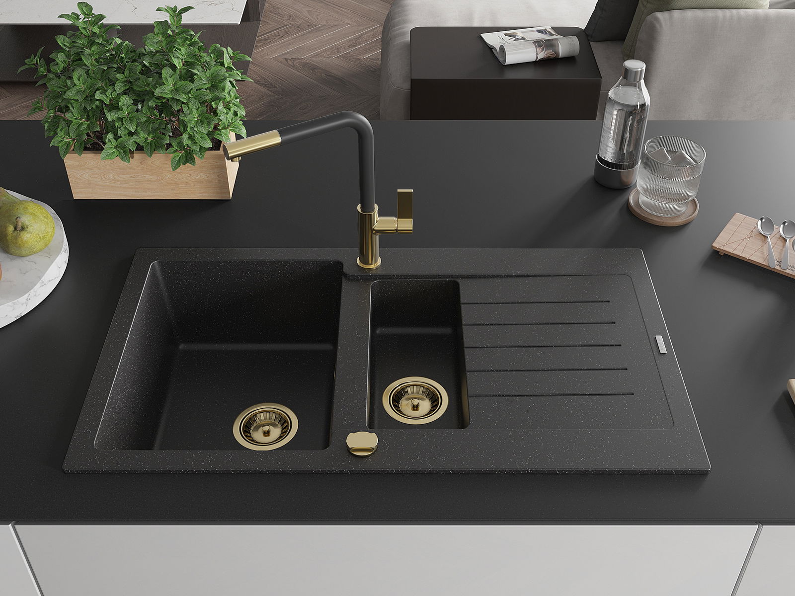 Mexen Matias granito kriauklė 1,5-komorinė su lašintuvu ir Flora virtuvės čiaupu, juodas/sidabrinis - 6502-73-670401-57-G