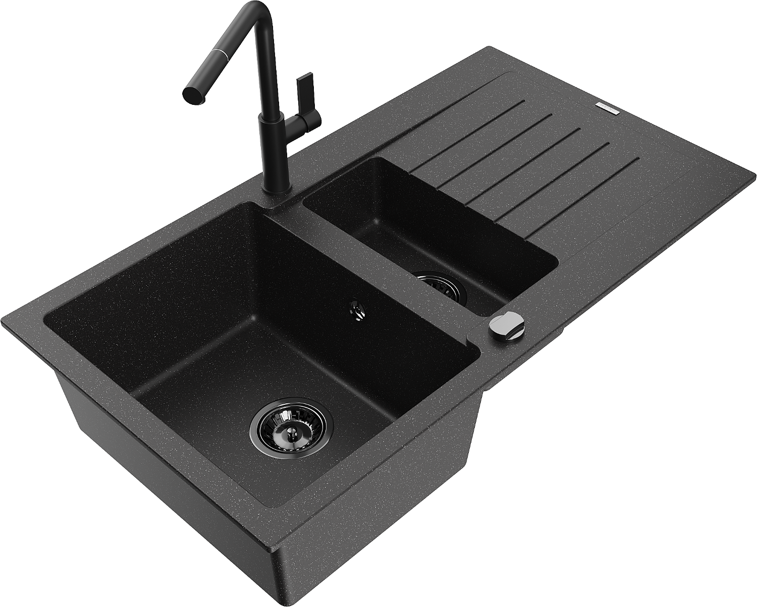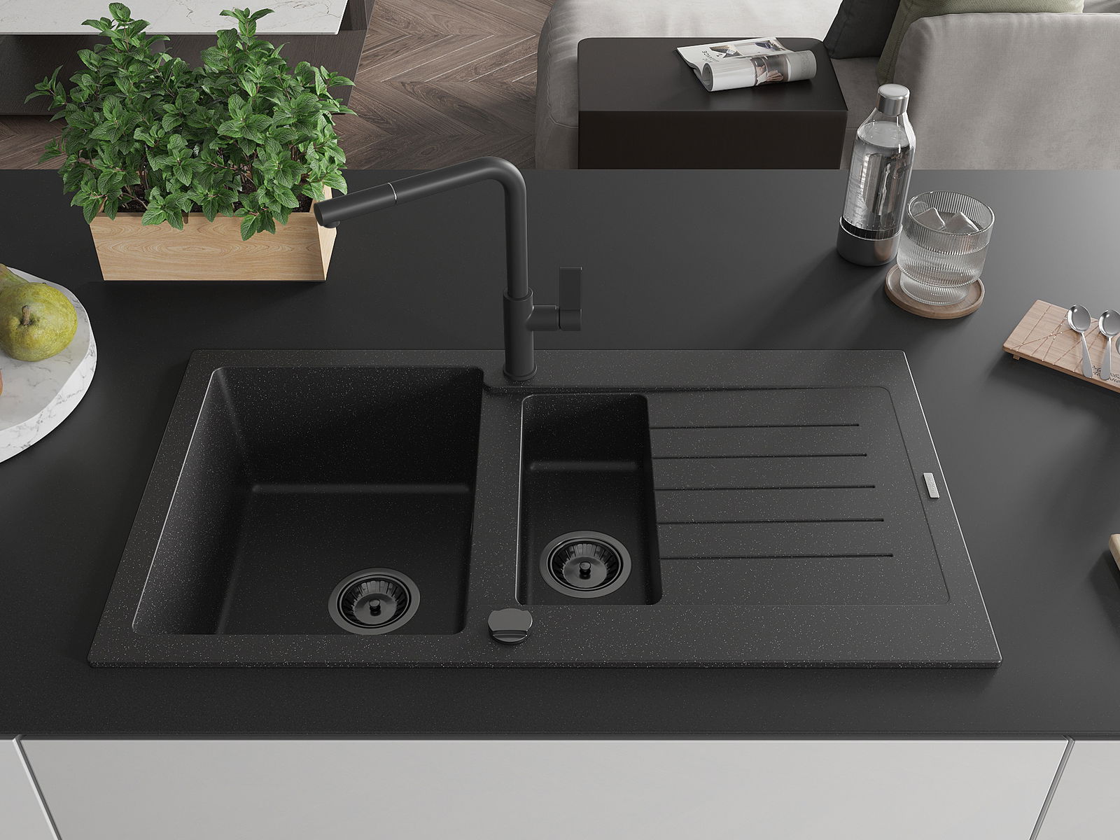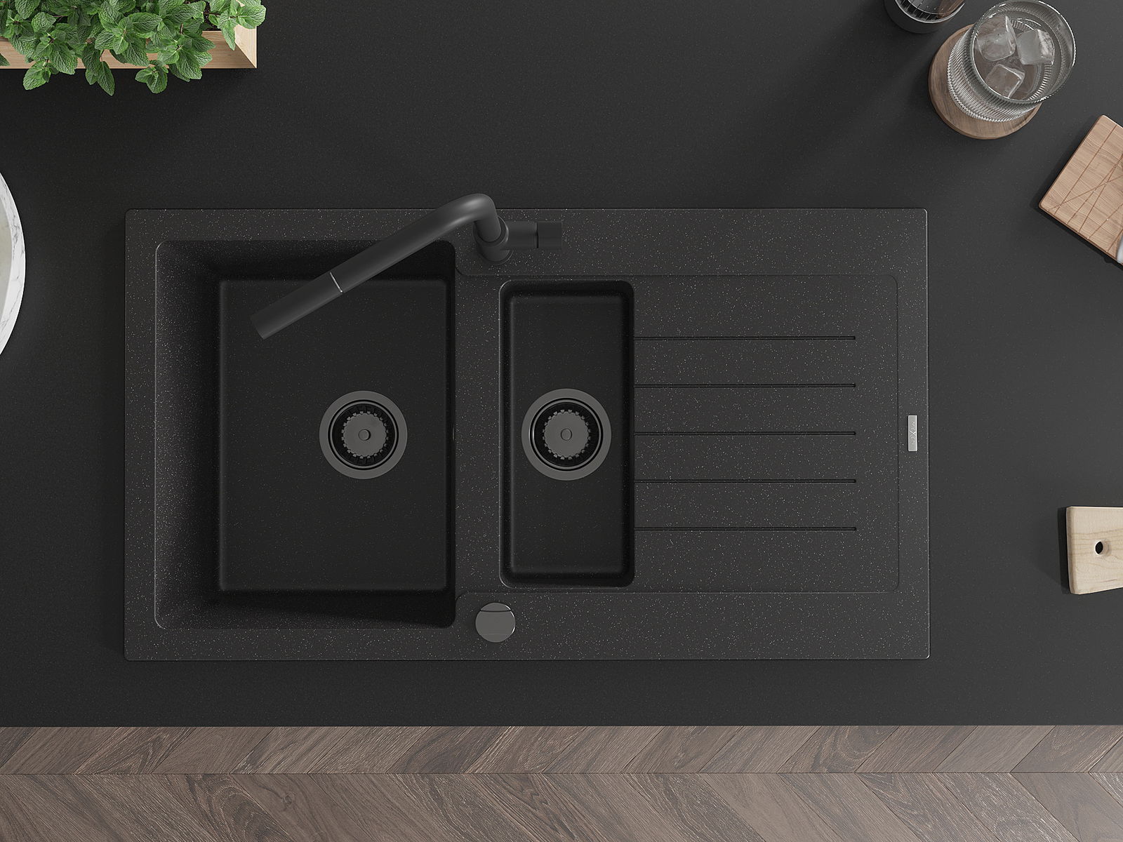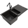 Mexen Matias granitinė 1,5 kameros kriauklė su nusausinimo lenta ir virtuviniu maišytuvu Flora, juoda/sidabrinė