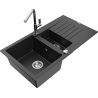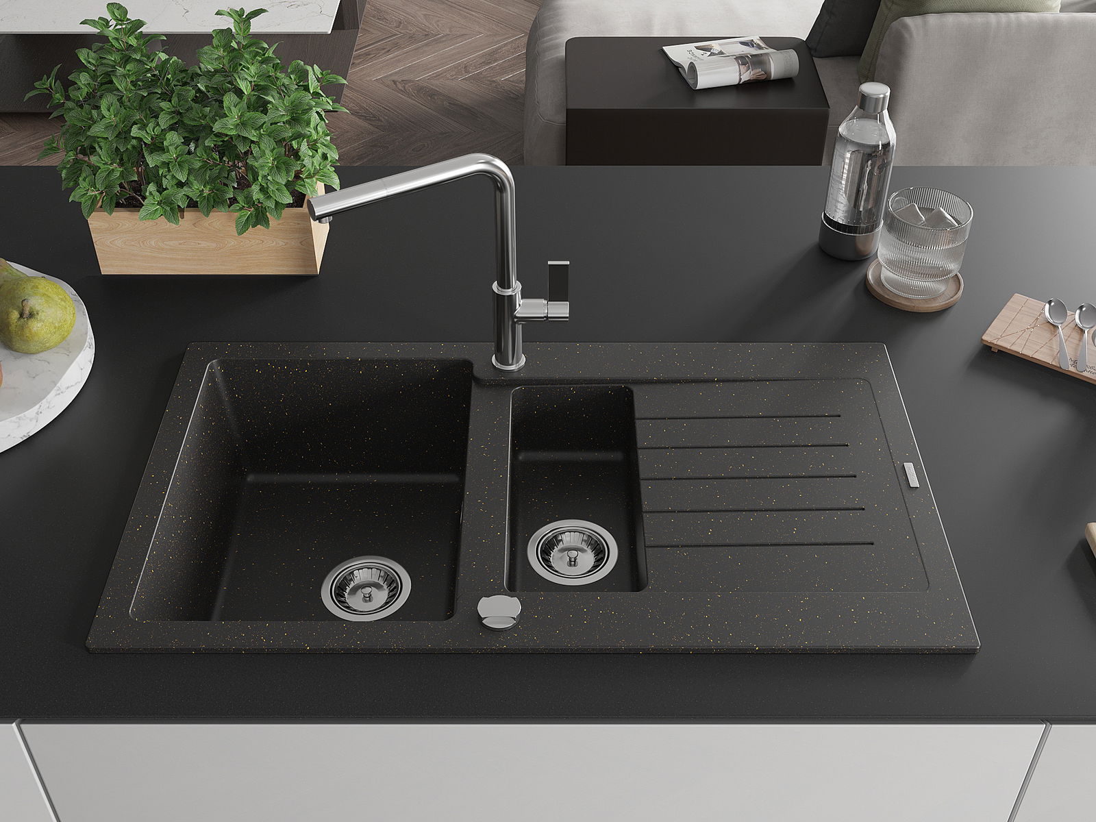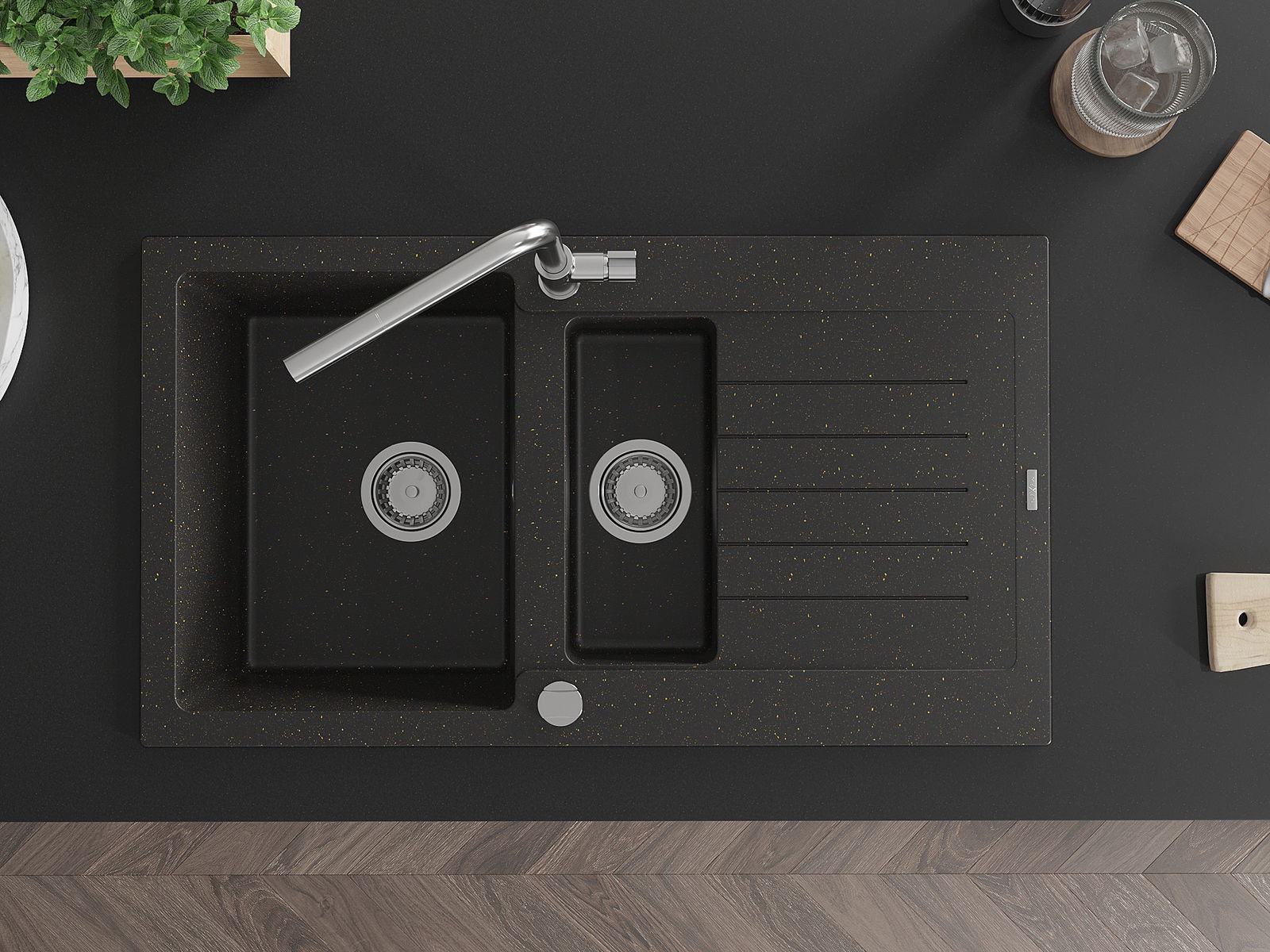 Mexen Matias 1,5 skyrių granitinė plautuvė su nutekamuoju paviršiumi ir Flora virtuvės čiaupu, juoda/auksinė metalika