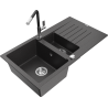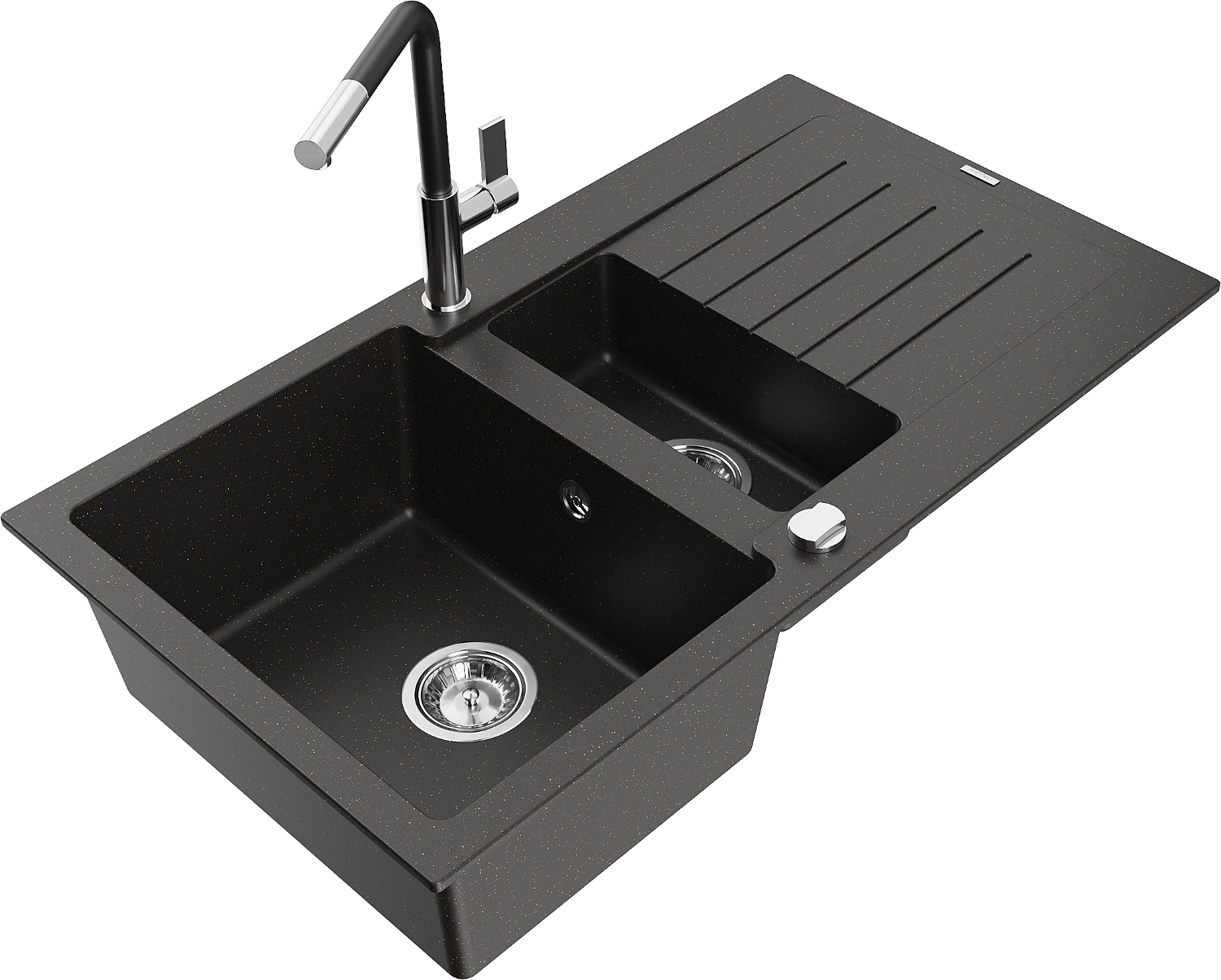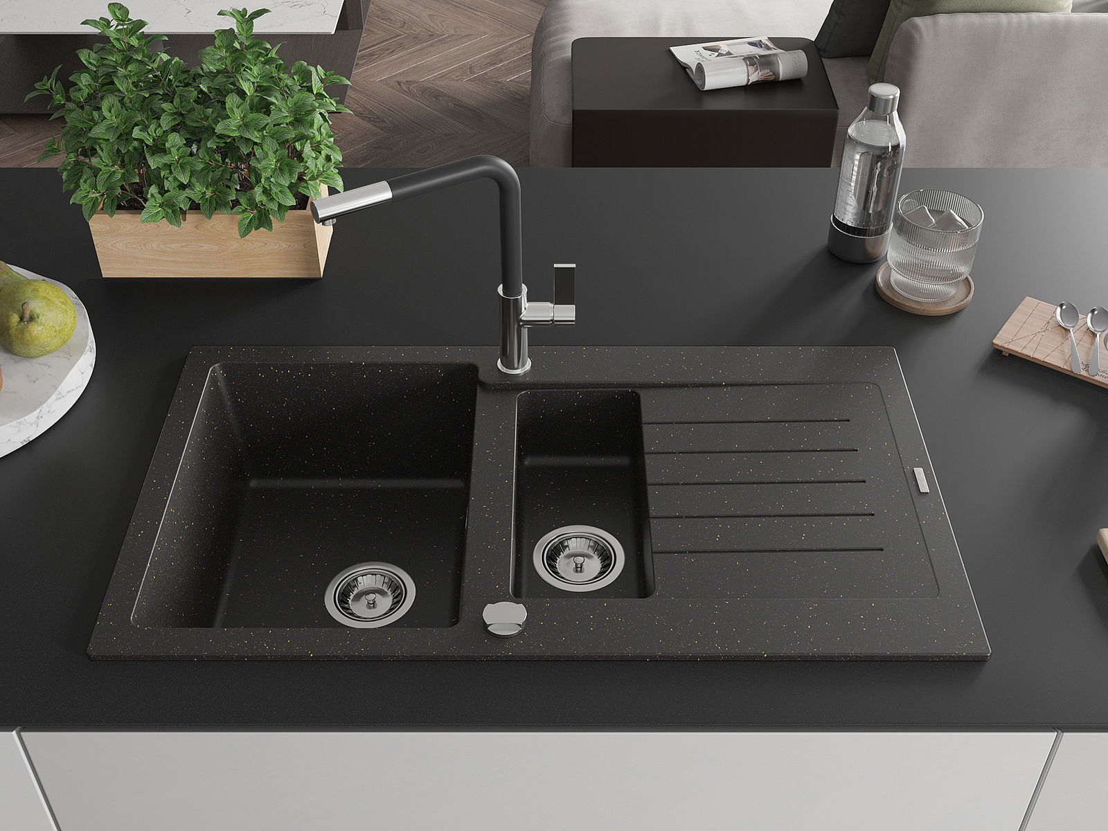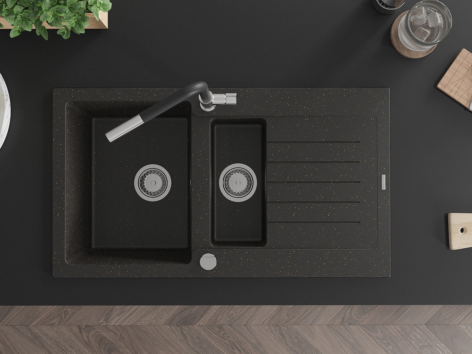 Mexen Matias grindinis 1,5 kamerų kriauklė su indaplovu ir Flora virtuvės maišytuvu, juoda/auksinė metalik