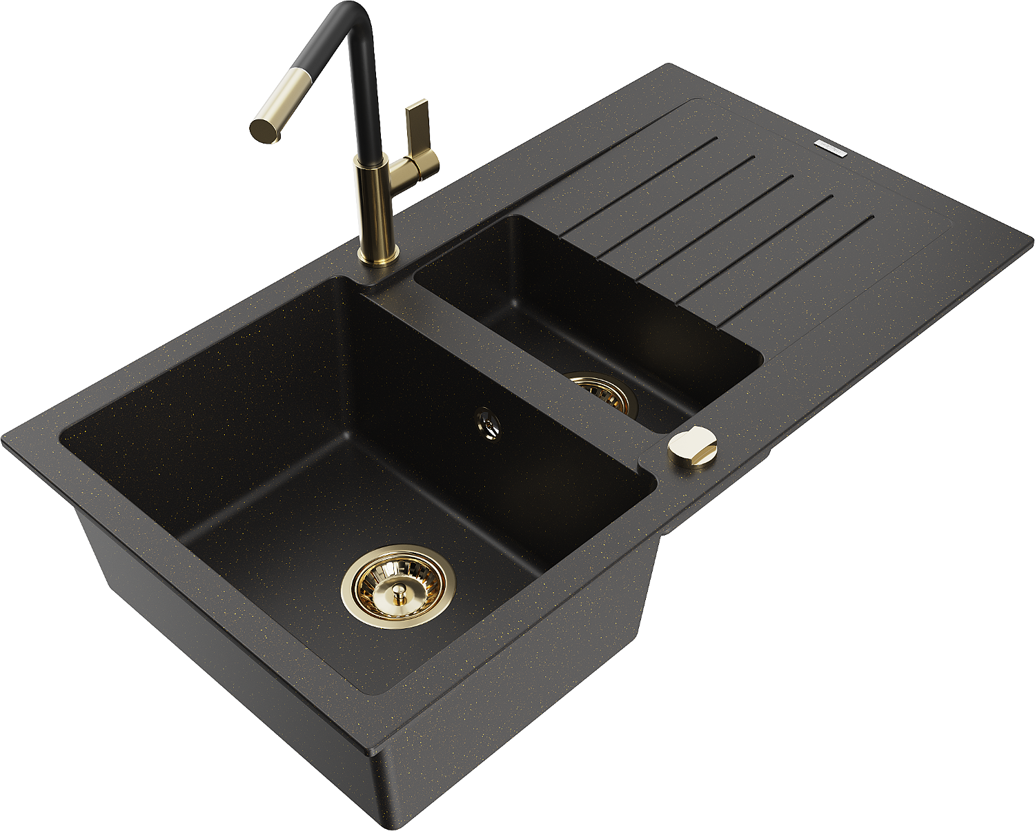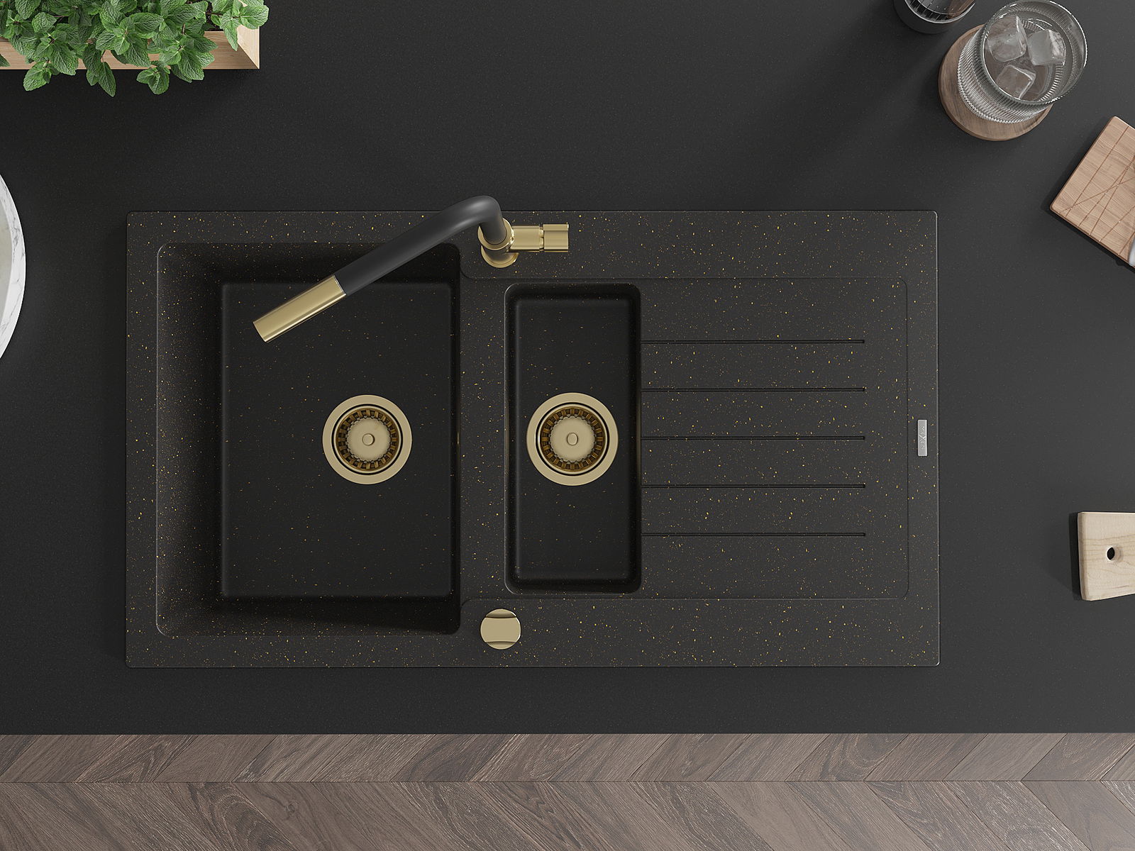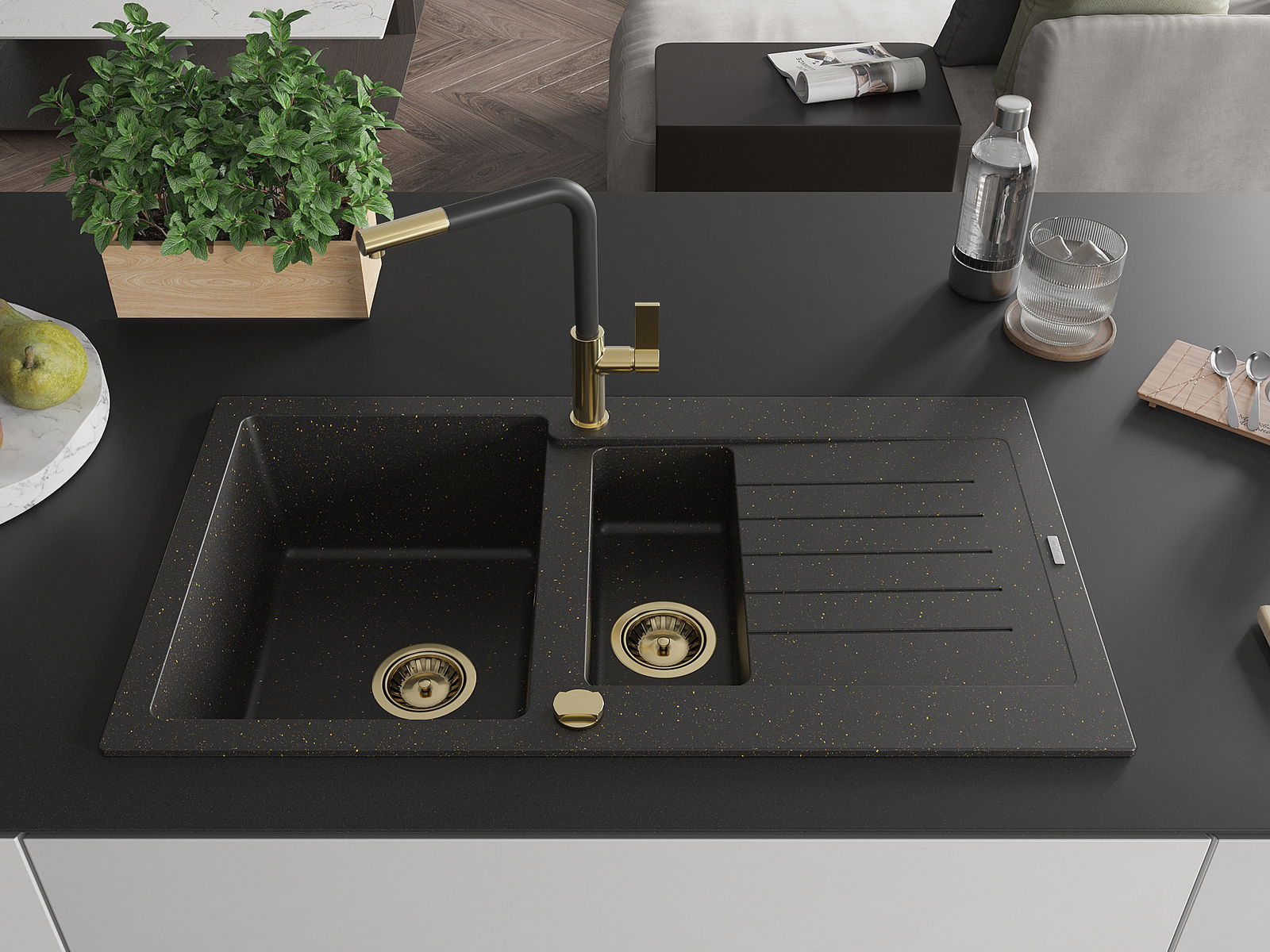 Mexen Matias 1,5 kamerų granitinė kriauklė su drenažu ir virtuviniu Flora maišytuvu, juoda/auksinė - 6502-75-670401-57-G