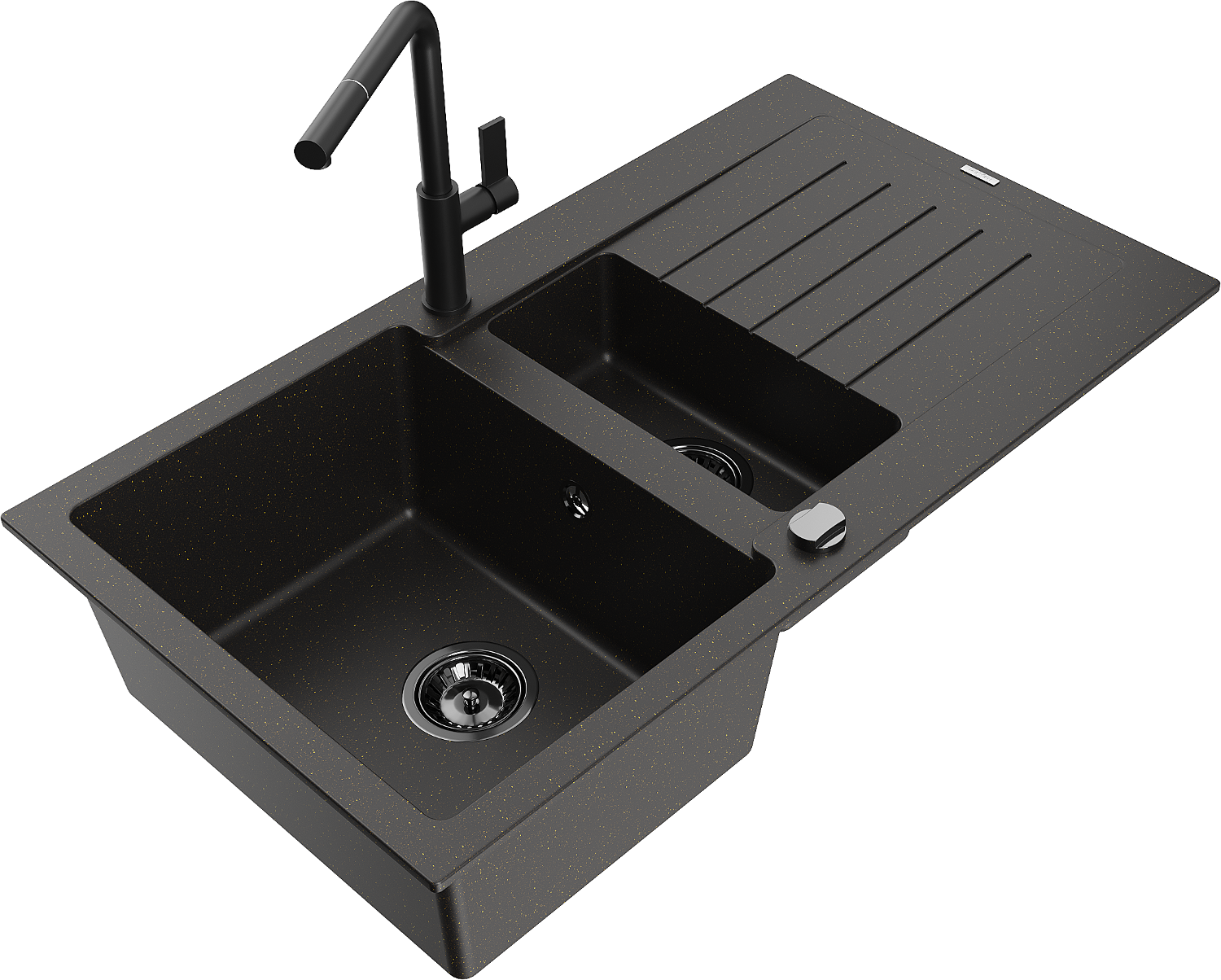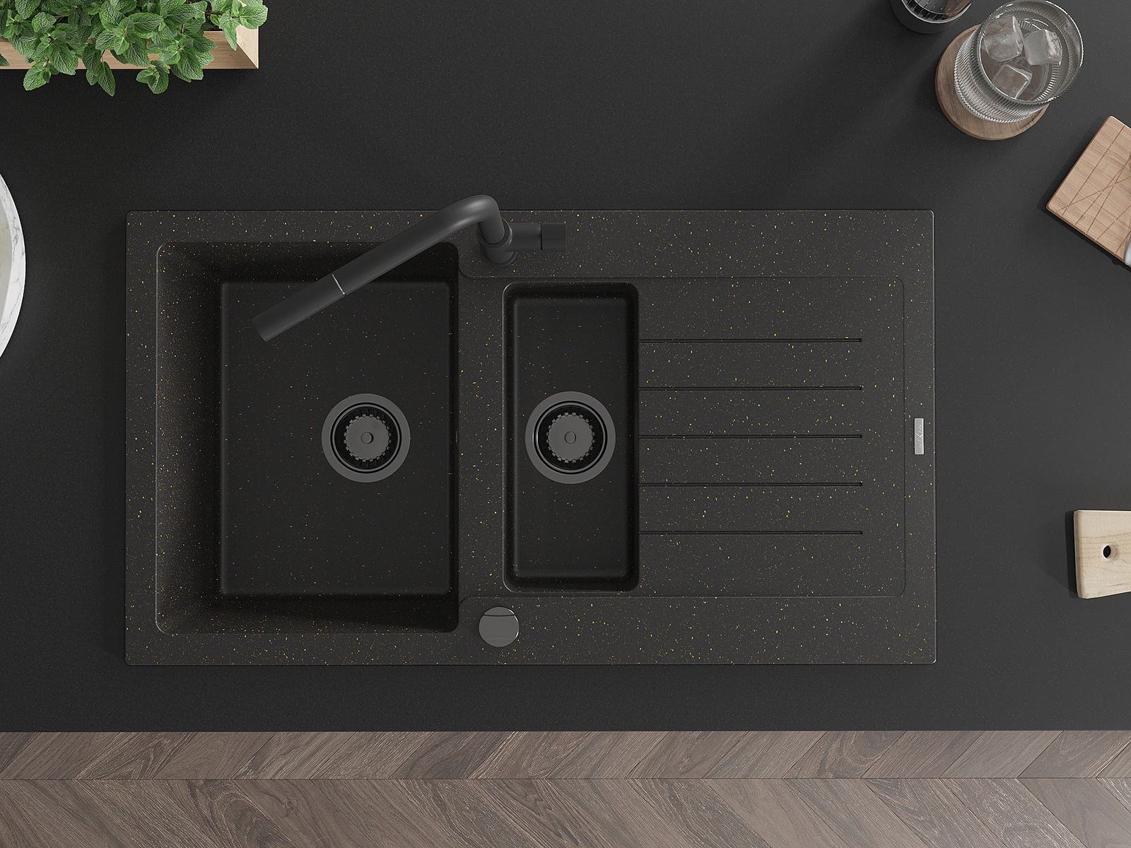 Mexen Matias granitinis 1,5 kamerų kriauklė su nusausintuvu ir virtuvės maišytuvu Flora, juoda/auksinė - 6502-75-670401-70-B