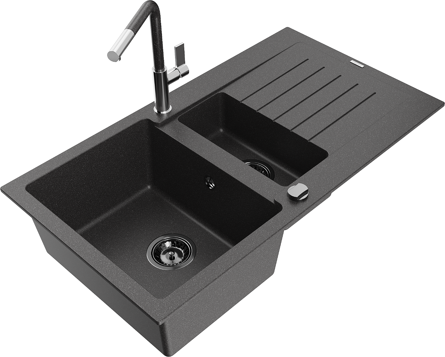 Mexen Matias granitinis kriauklė 1,5 skylių su nusausintuvu ir Flora virtuvės maišytuvu, juoda dėmėta - 6502-76-670401-08-B