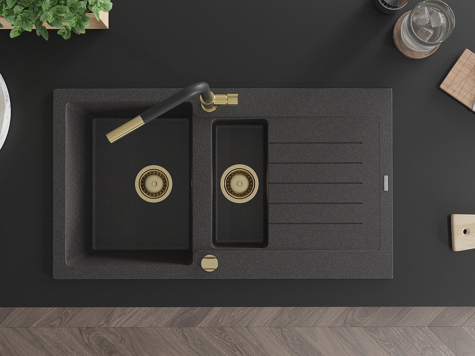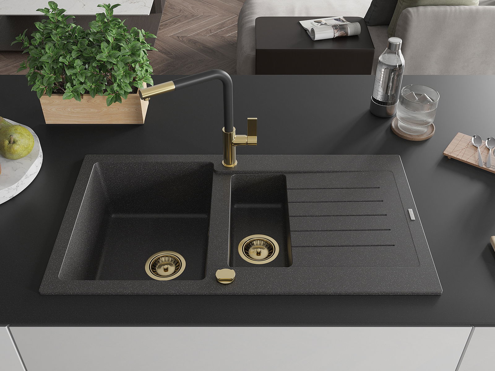 Mexen Matias grindinis granitinis plautuvas su 1,5 skyriais, su nusausintuvu ir virtuviniu Flora maišytuvu, juodas taškuotas