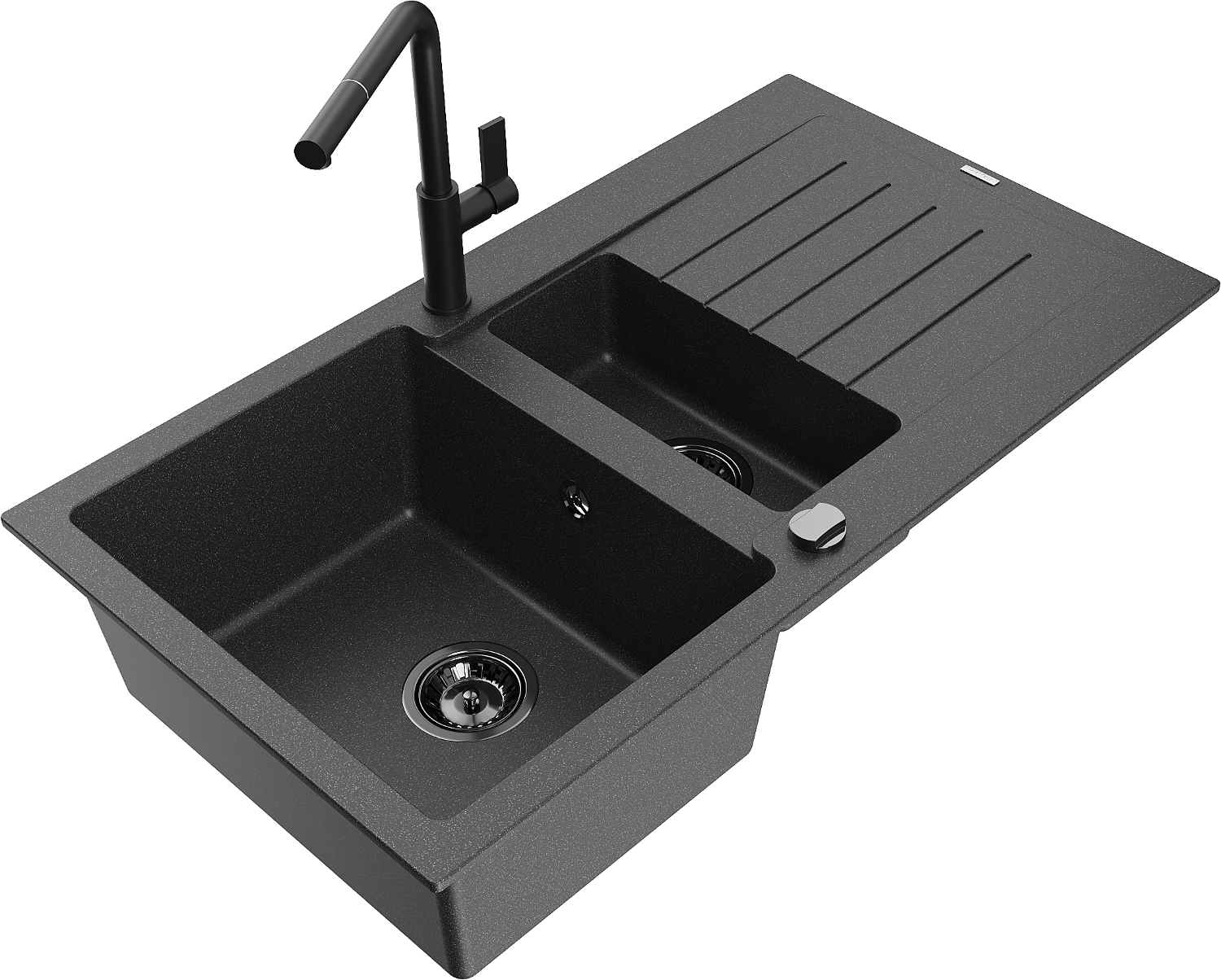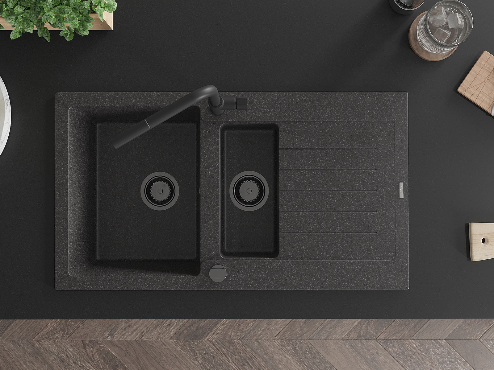 Mexen Matias granitinis plautuvės 1,5 kamerų su džiovykla ir virtuviniu maišytuvu Flora, juodas dėmėtas - 6502-76-670401-70-B