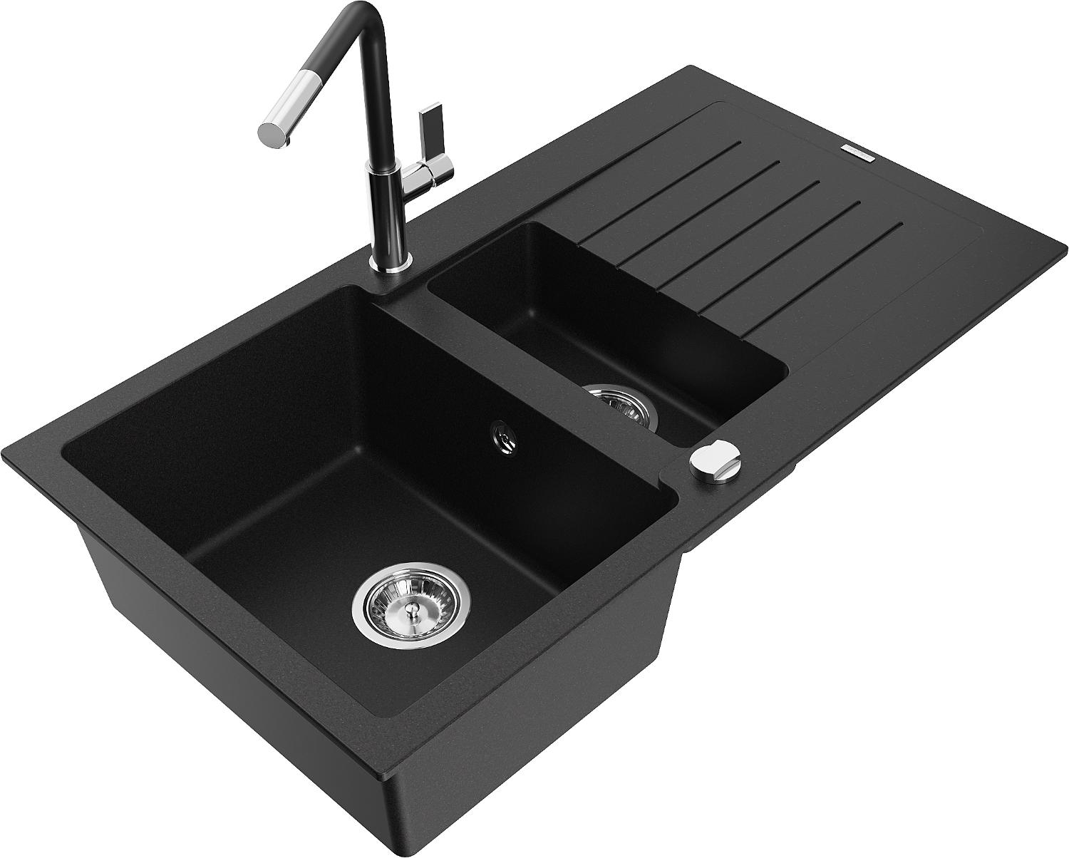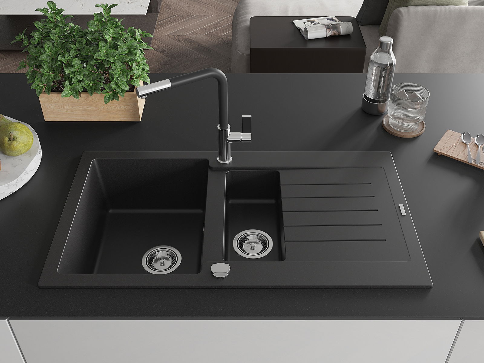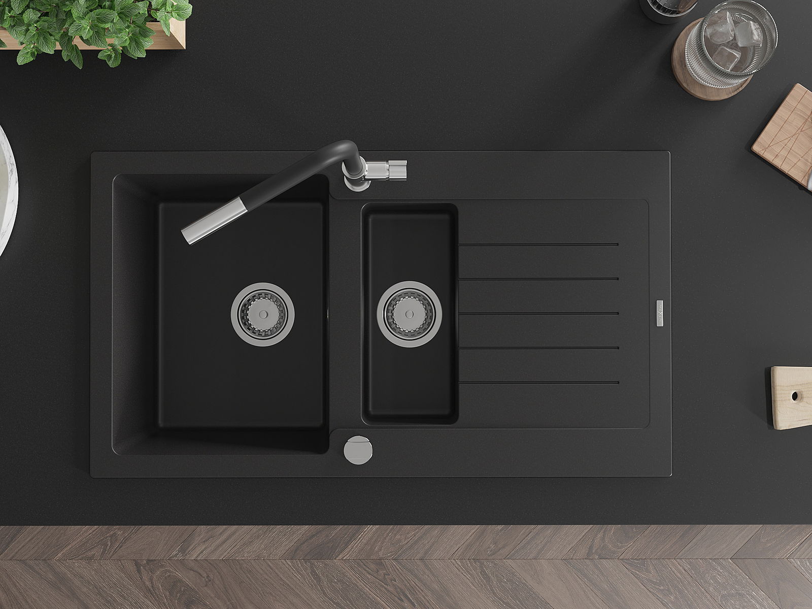 Mexen Matias granito plautuvė 1,5 skyrių su nutekamuviete ir virtuvės maišytuvu Flora, juoda - 6502-77-670401-07