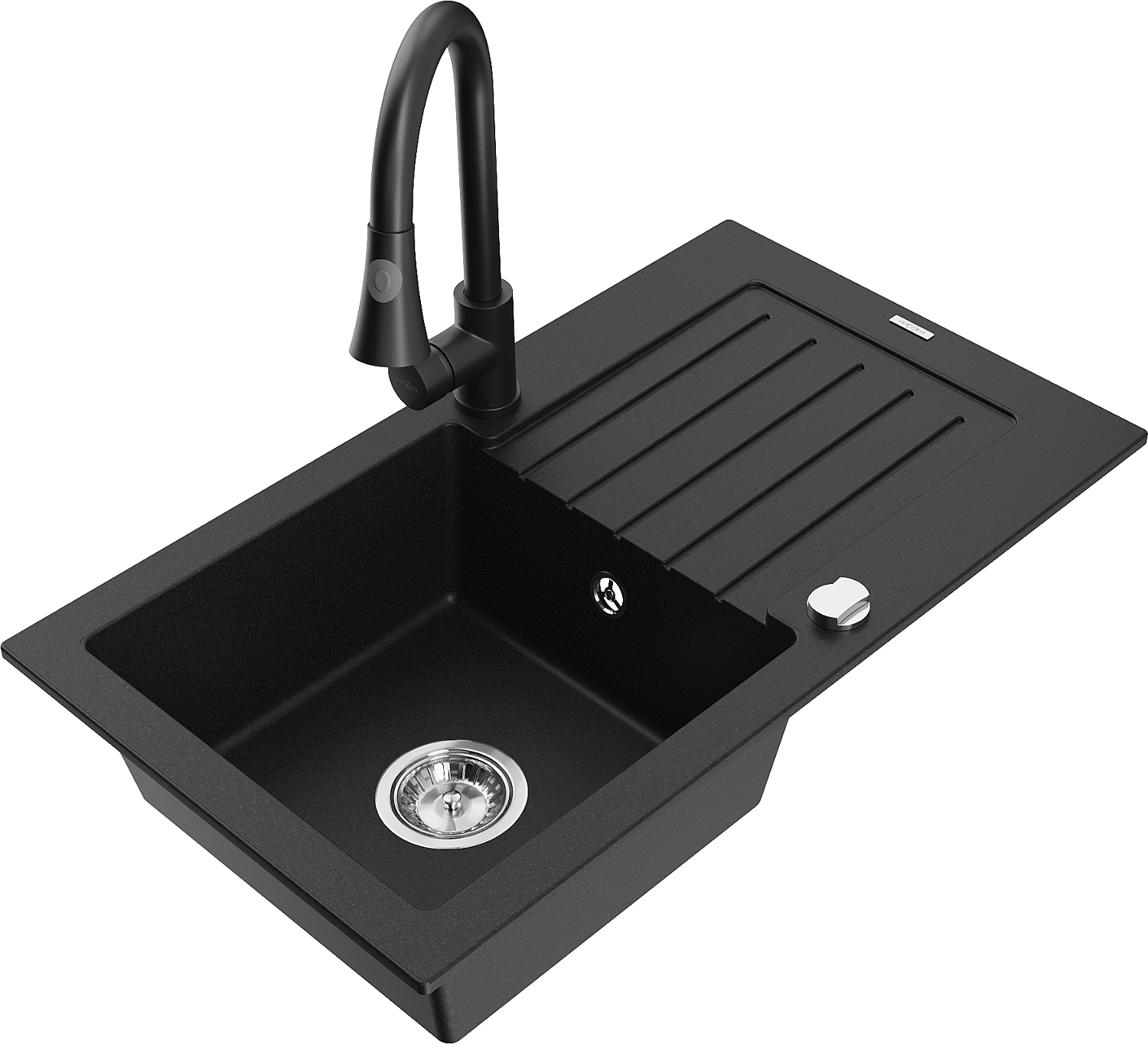 Mexen Pablo granito virtuvės plautuvė 1 skyrelio su nusausintuvu ir virtuvės maišytuvu Elia, juoda - 6510-77-670101-70