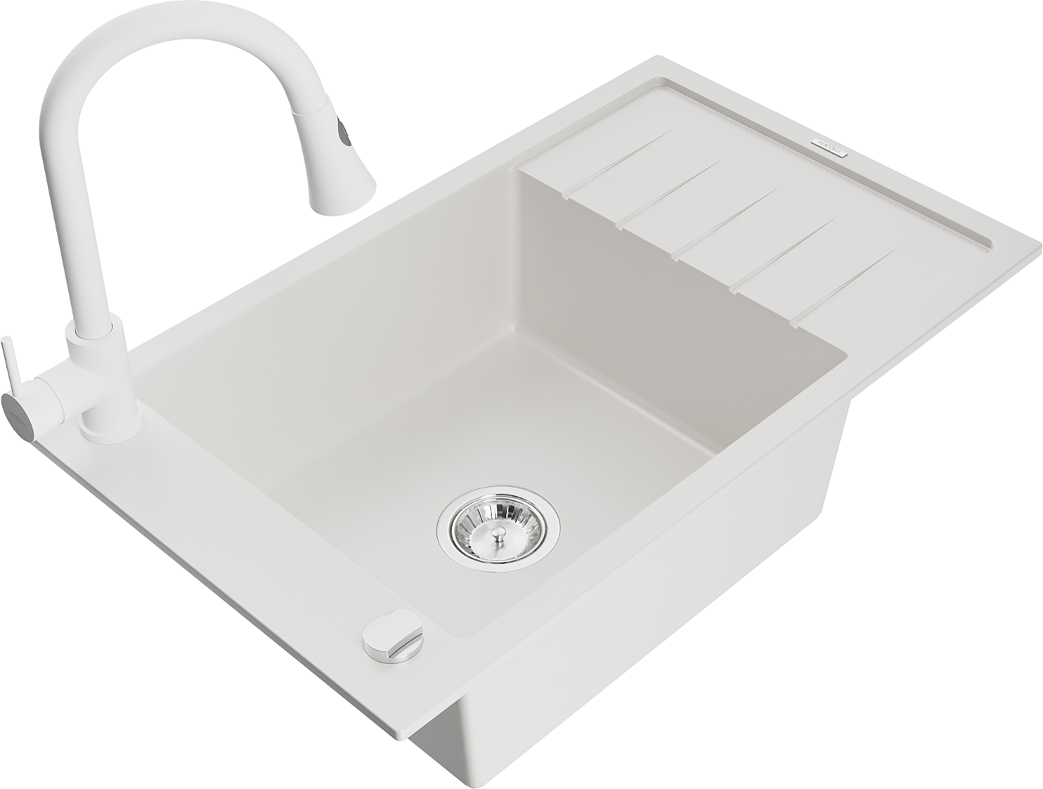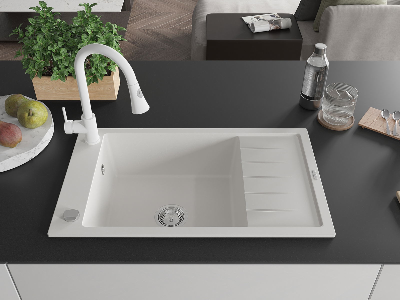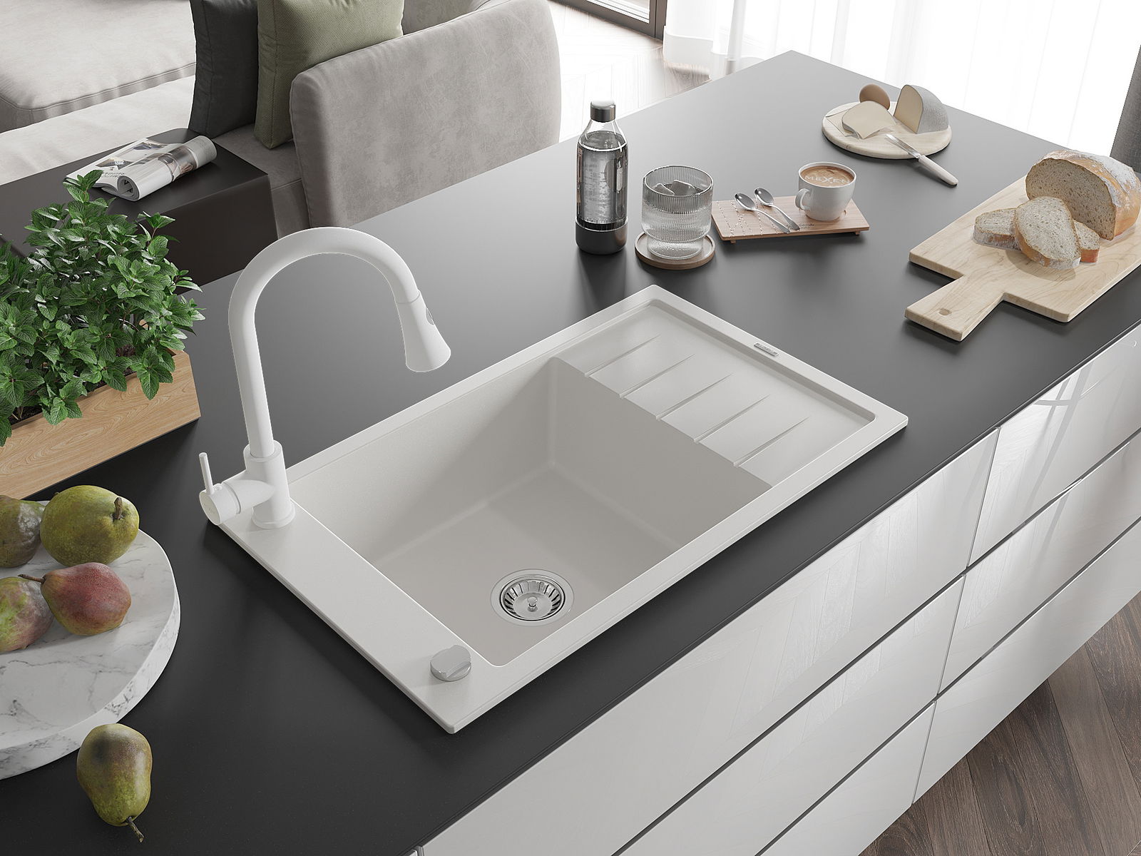 Mexen Elias granito plautuvė 1-dubenio su nutekamu ir virtuviniu maišytuvu Elia, balta - 6511-20-670101-20