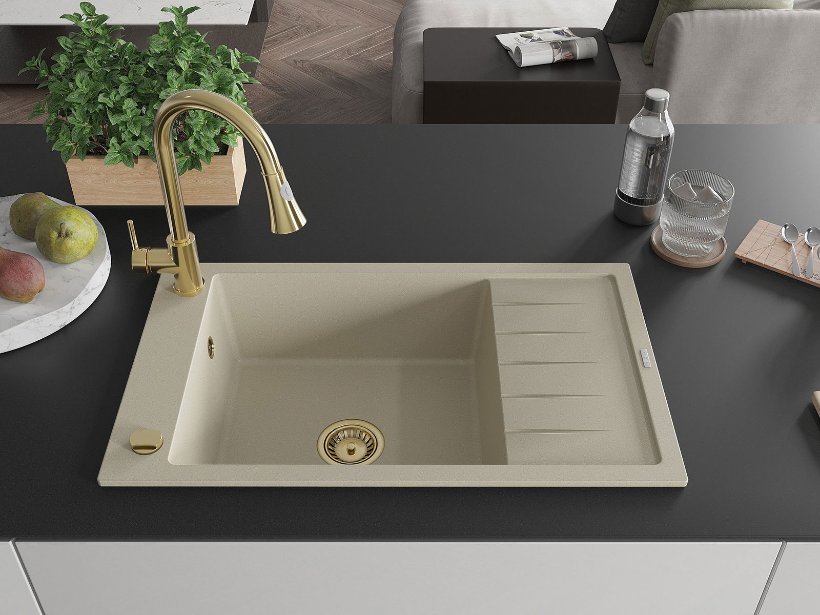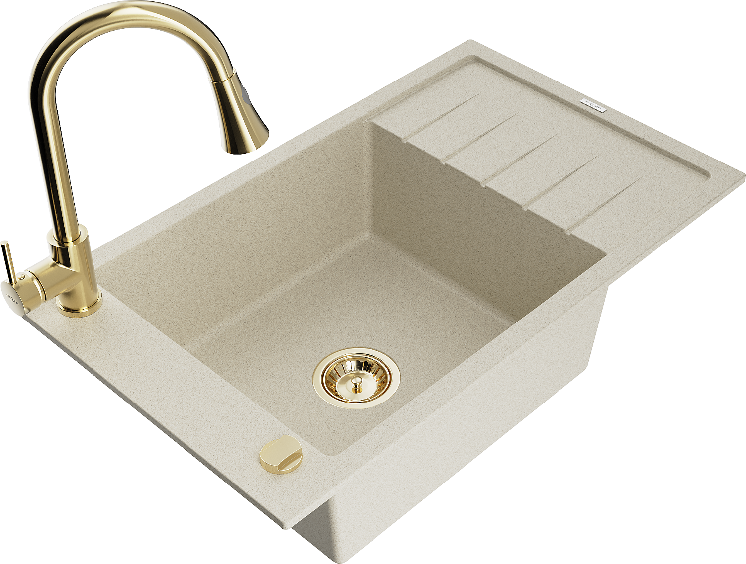 Mexen Elias vienos sekcijos granitinė kriauklė su nusausintuvu ir virtuviniu maišytuvu Elia, smėlio spalvos