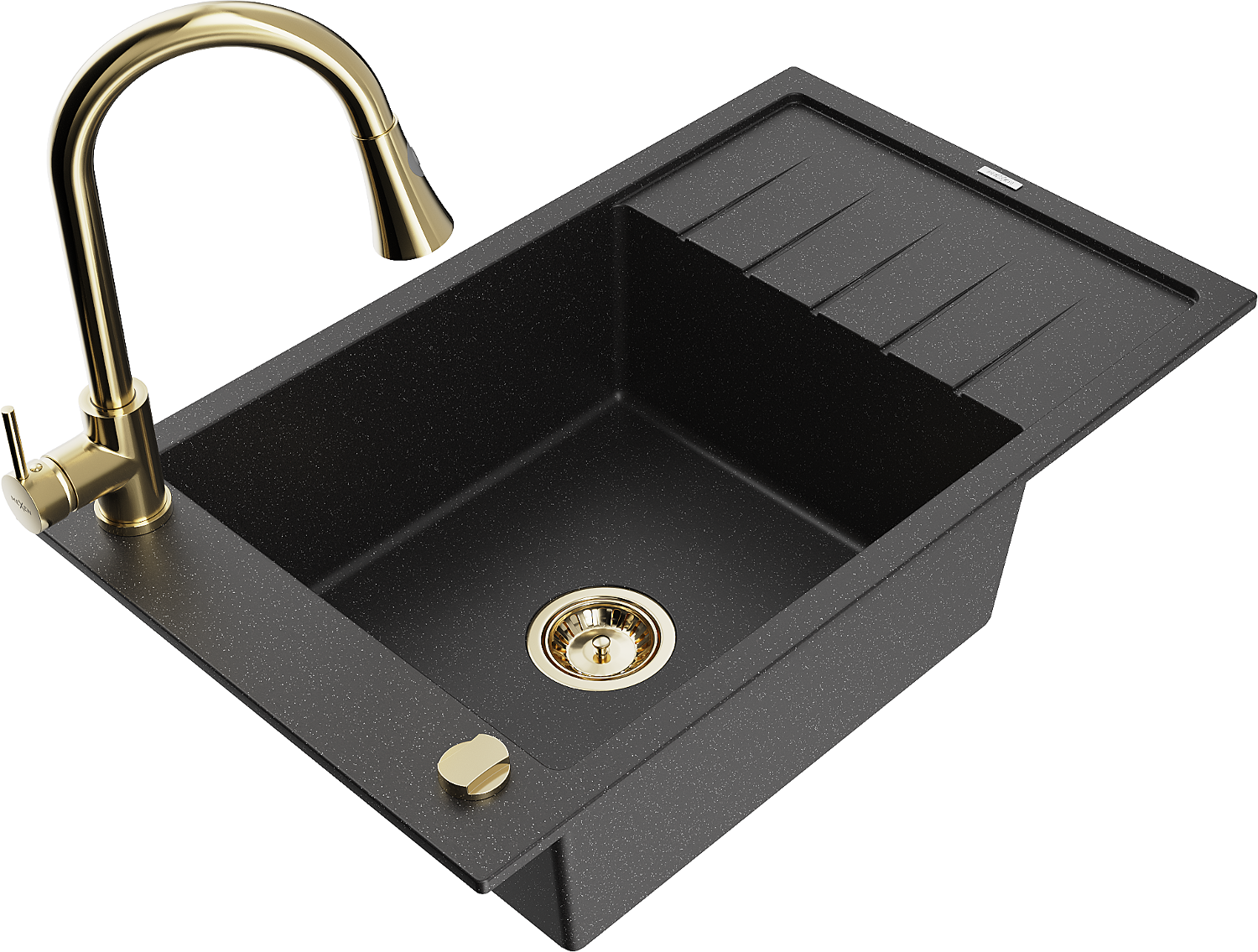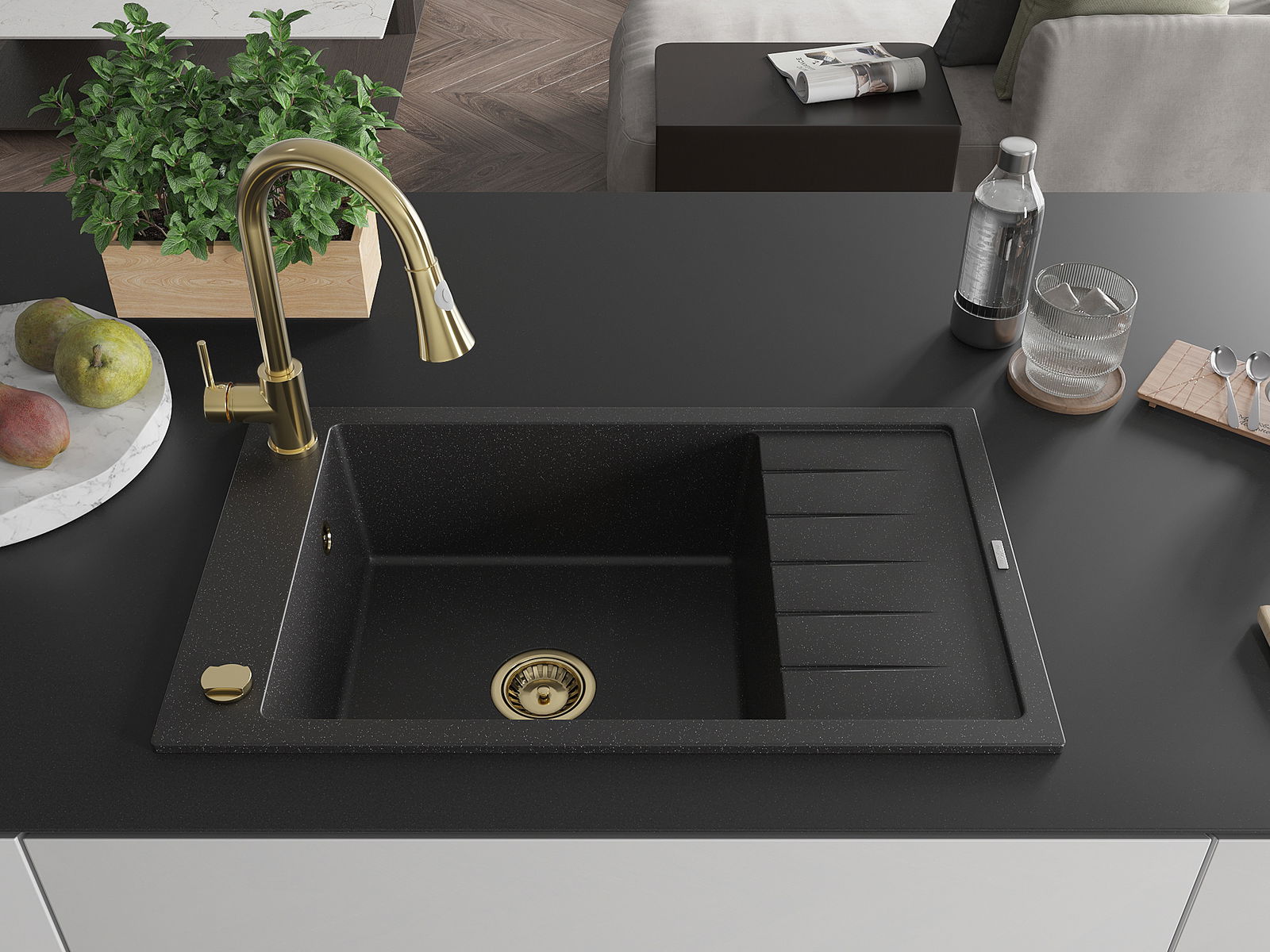 Mexen Elias vienos dalies granito kriauklė su nutekėjimu ir virtuviniu maišytuvu Elia, juodas/sidabrinis metalikas