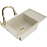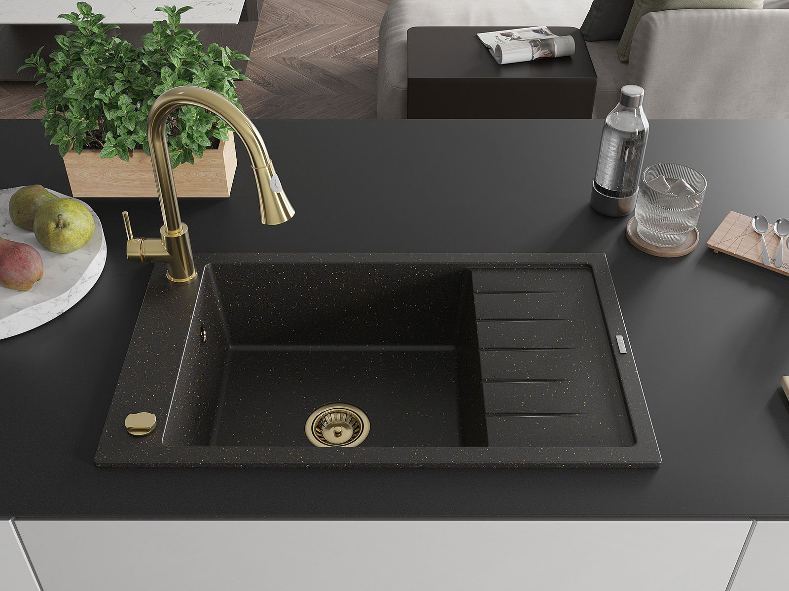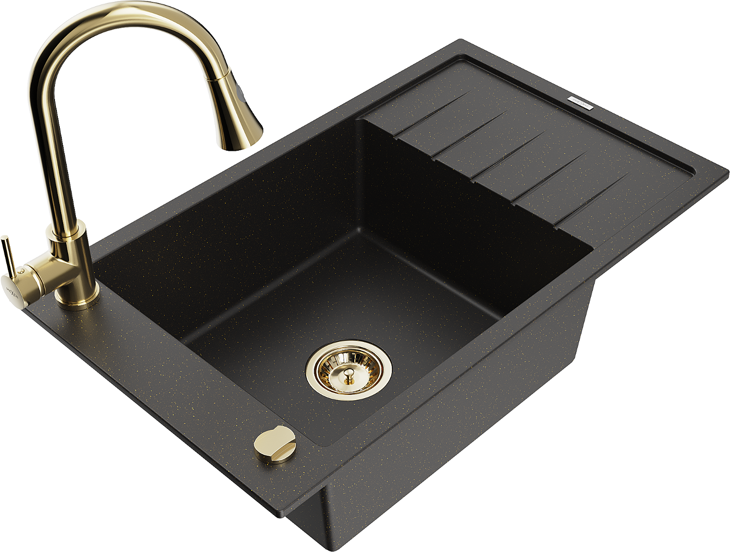 Mexen Elias vienos kameros granitinis plautuvas su varvekliu ir virtuviniu maišytuvu Elia, juodas/auksinis metalikas