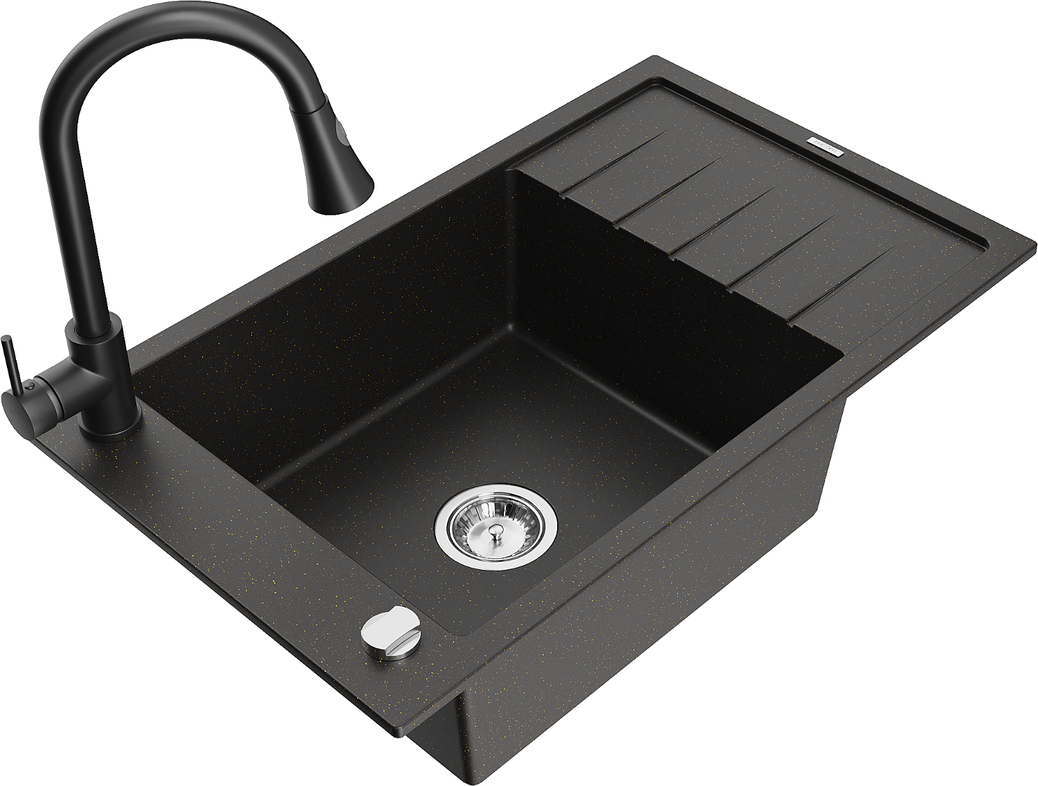 Mexen Elias granitinė vienos kameros plautuvė su nusausintuvu ir virtuviniu maišytuvu Elia, juoda/auksinė metalo