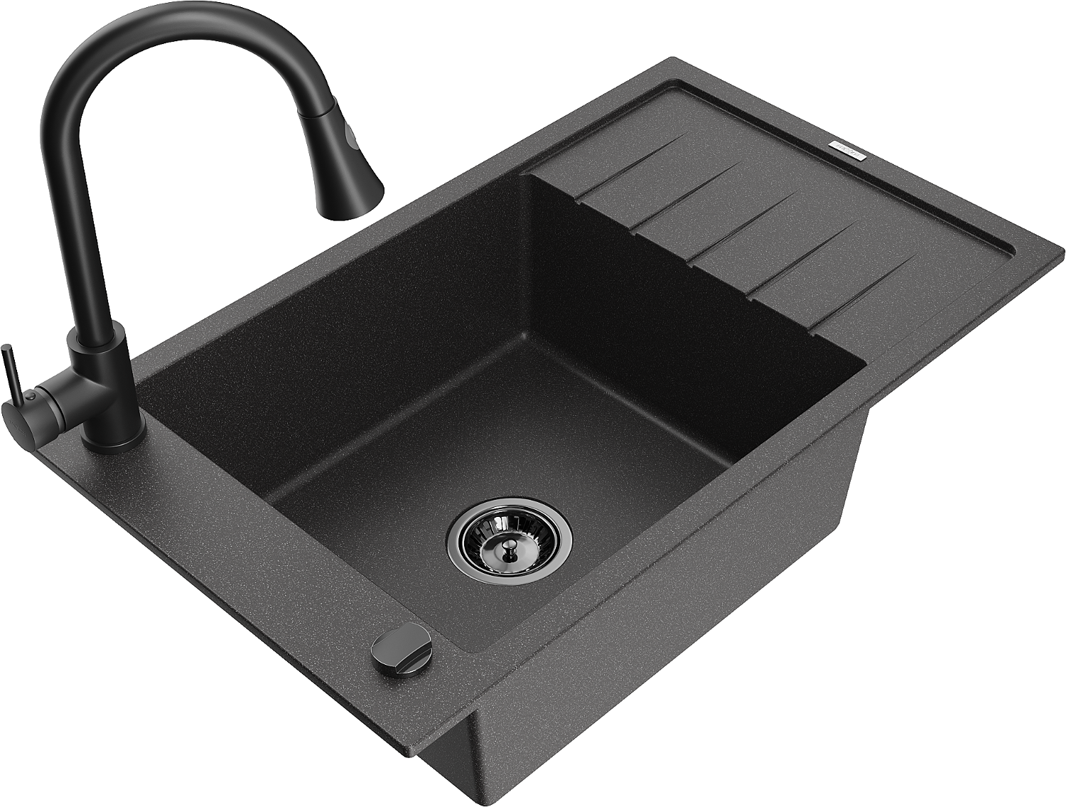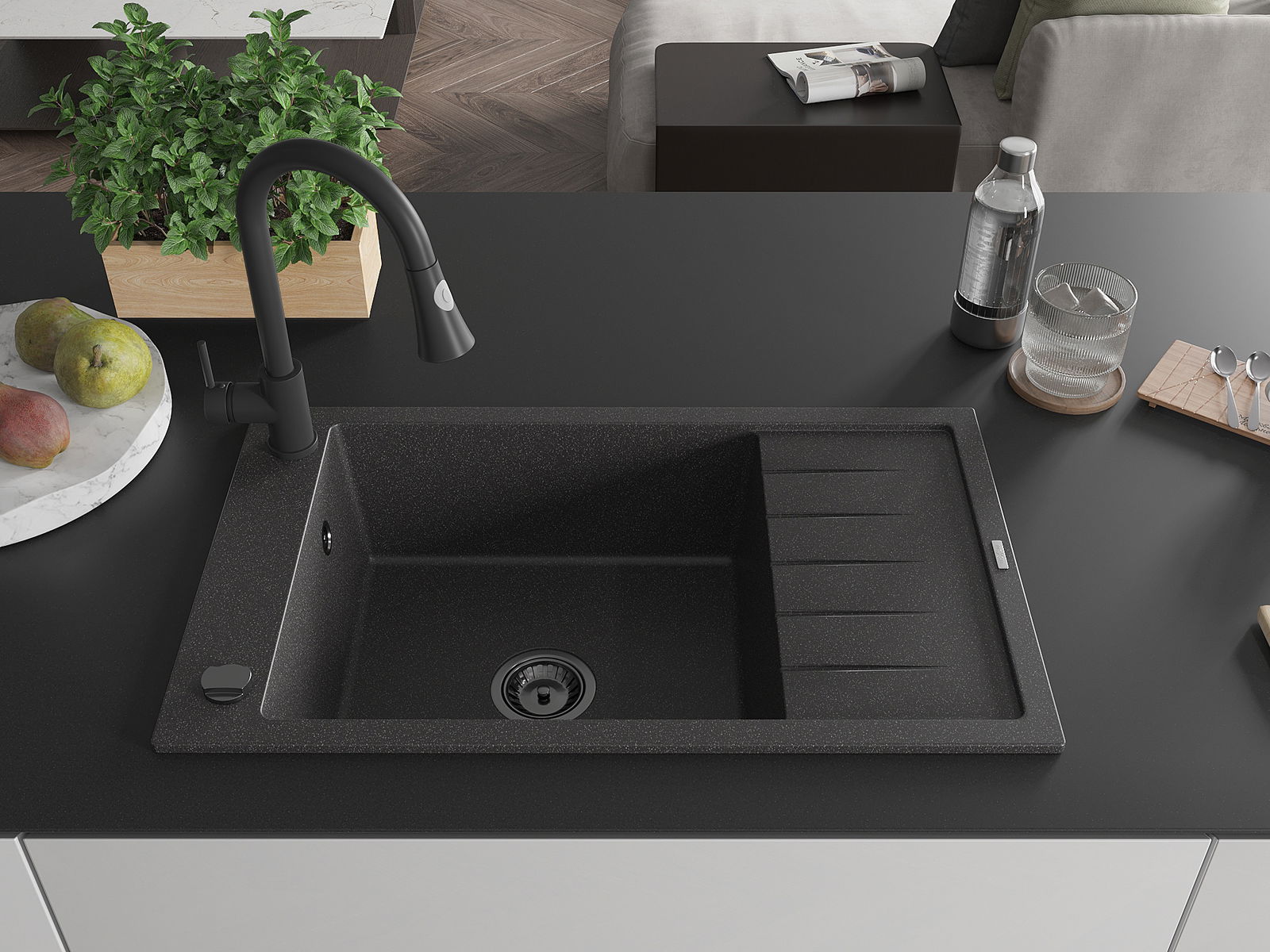 Mexen Elias vienos komoros granito kriauklė su nuotėkiu ir virtuvės maišytuvu Elia, juodas dėmėtas - 6511-76-670101-70-B