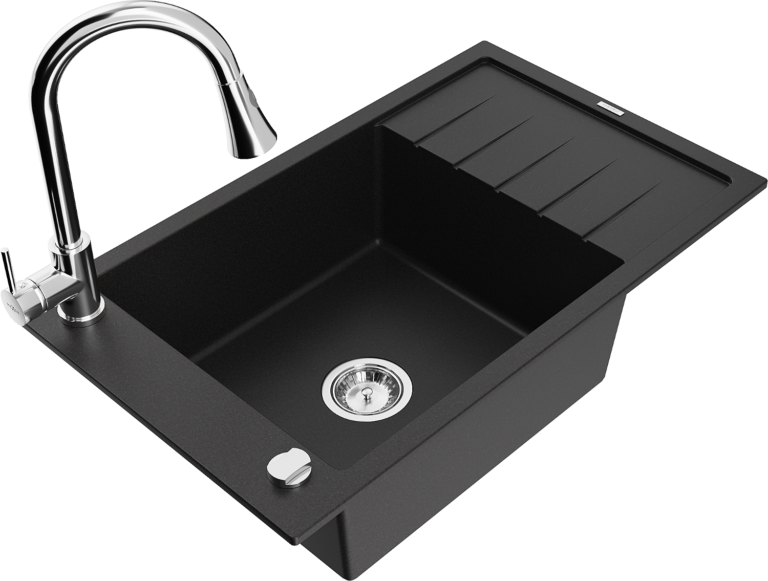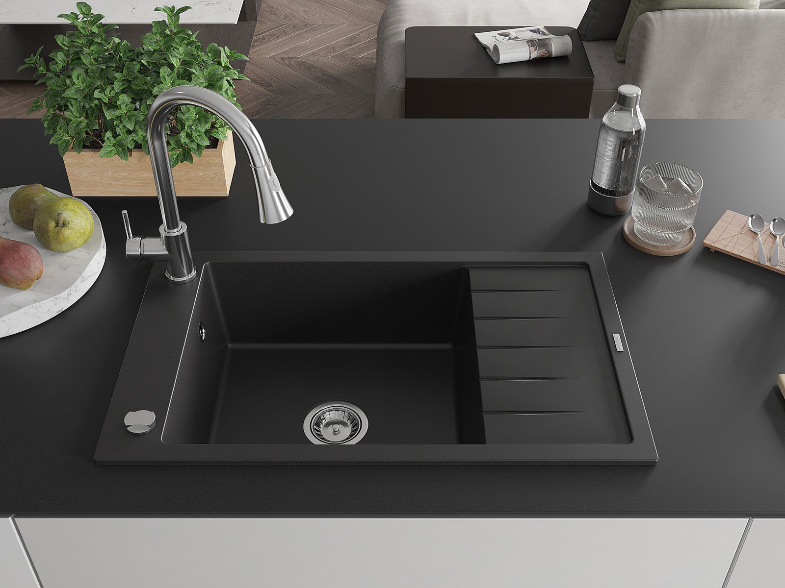 Mexen Elias vienos kameros granito plautuvė su lašėjimo plokštuma ir virtuvės maišytuvu Elia, juoda - 6511-77-670101-00