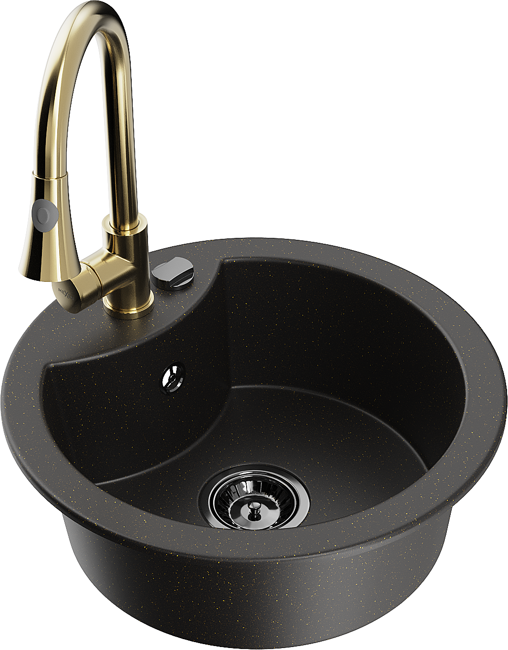 Mexen Diego vienos kameros granito kriauklė su virtuviniu maišytuvu Elia, juodas/auksinis metalikas - 6512-75-670101-50-B