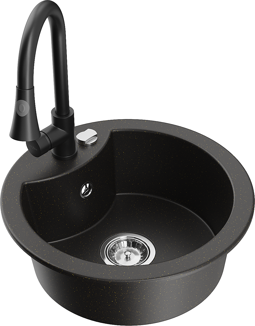 Mexen Diego granito kriauklė su viena kamera ir virtuviniu maišytuvu Elia, juodas/auksinis metalikas - 6512-75-670101-70