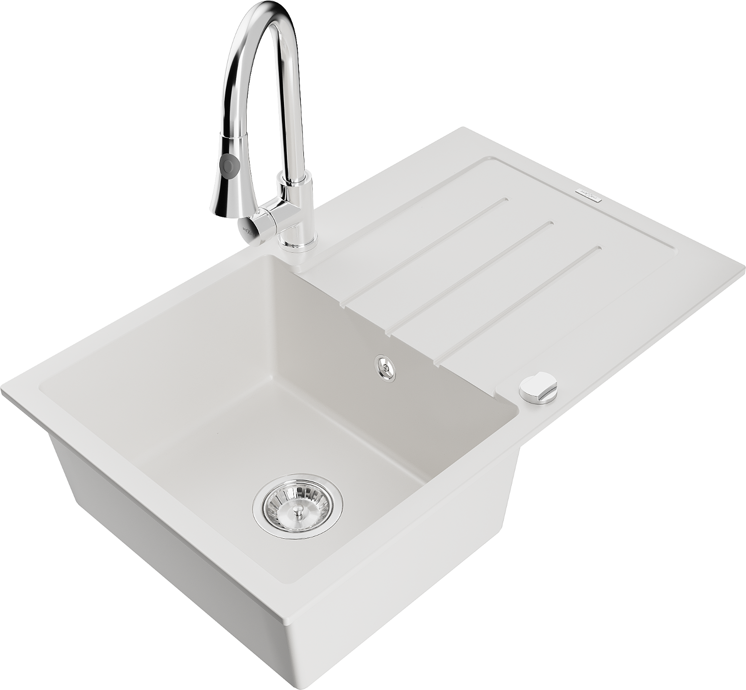 Mexen Bruno vienos kriauklės granito kriauklė su nusausintoju ir virtuviniu maišytuvu Elia, balta - 6513-20-670101-00