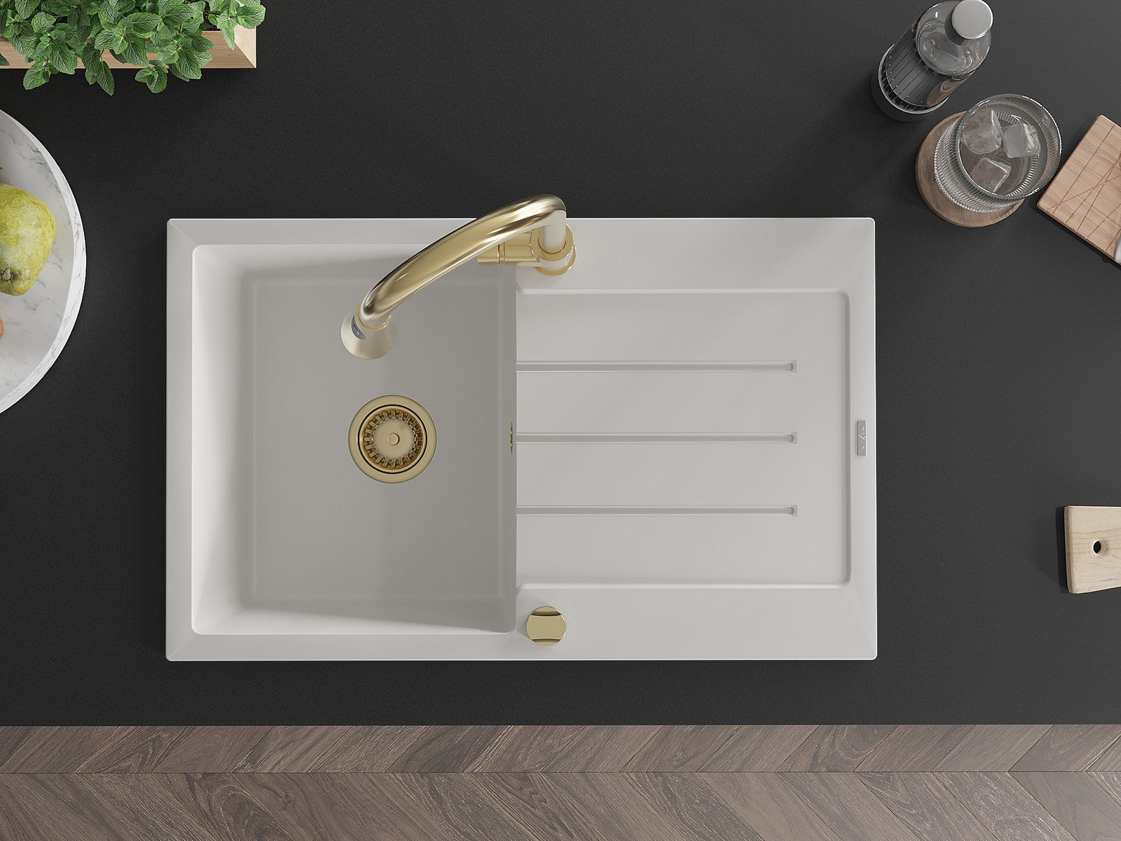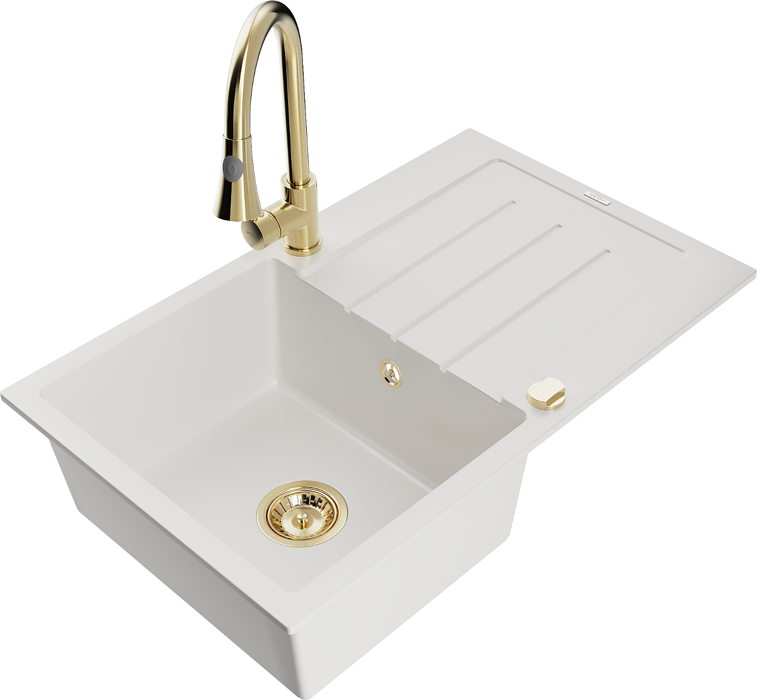 Mexen Bruno granitinis plautuvės 1-jų skyrių su nusausintuvu ir virtuvės maišytuvas Elia, baltas - 6513-20-670101-50