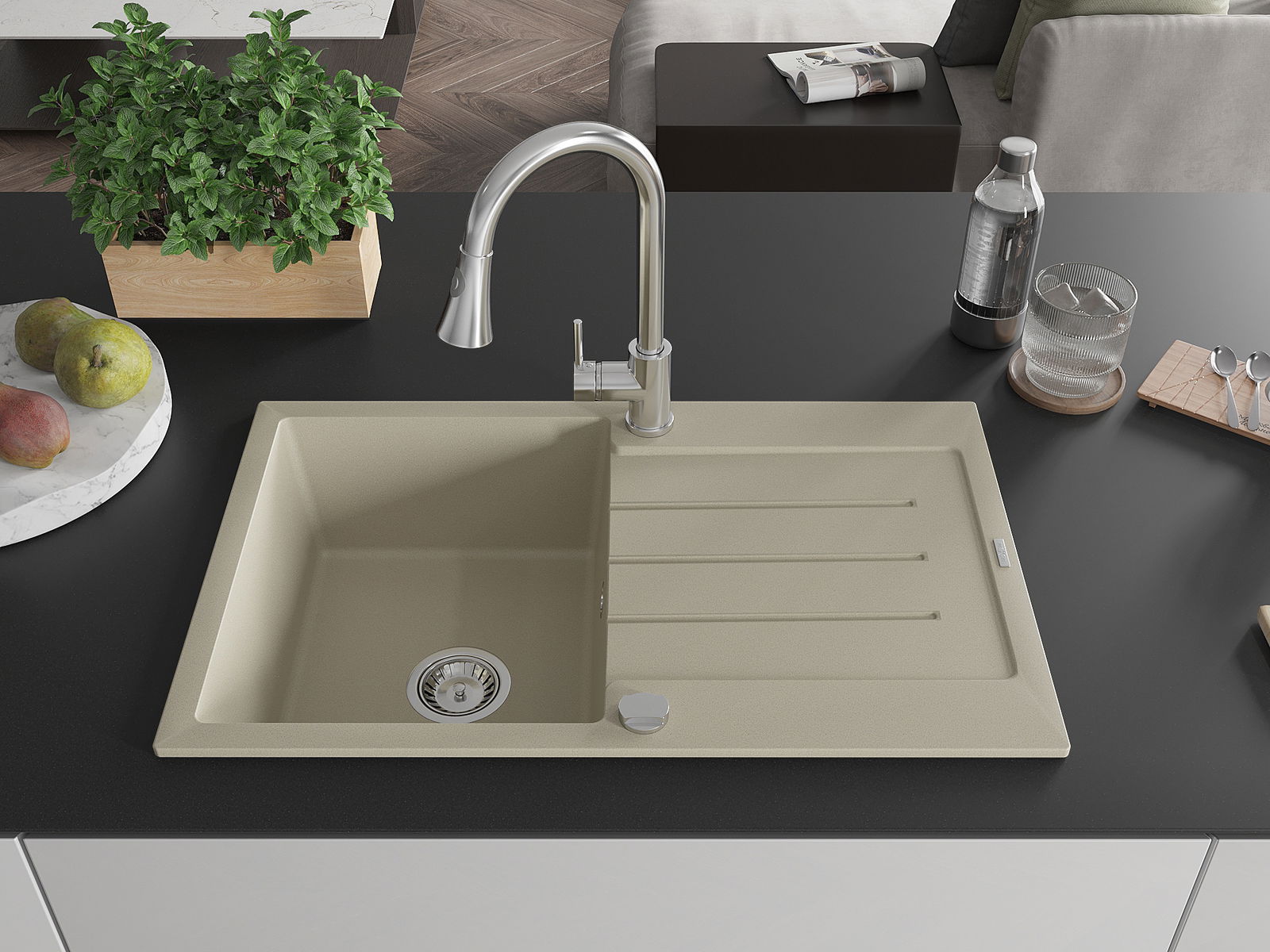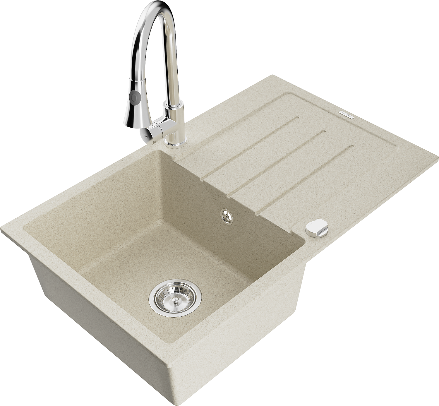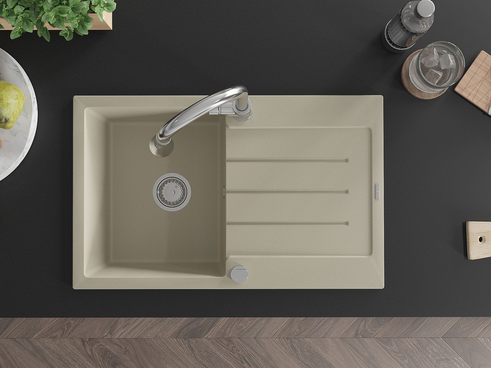 Mexen Bruno vienos kameros granito kriauklė su nusausintuvu ir virtuviniu maišytuvu Elia, smėlio spalvos - 6513-69-670101-00