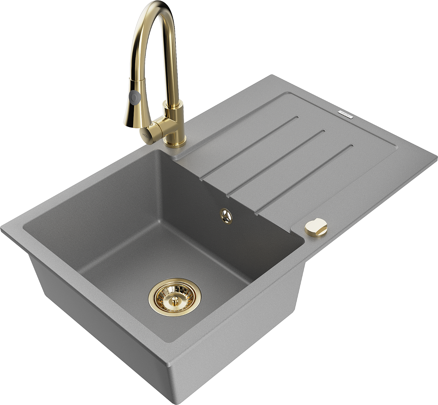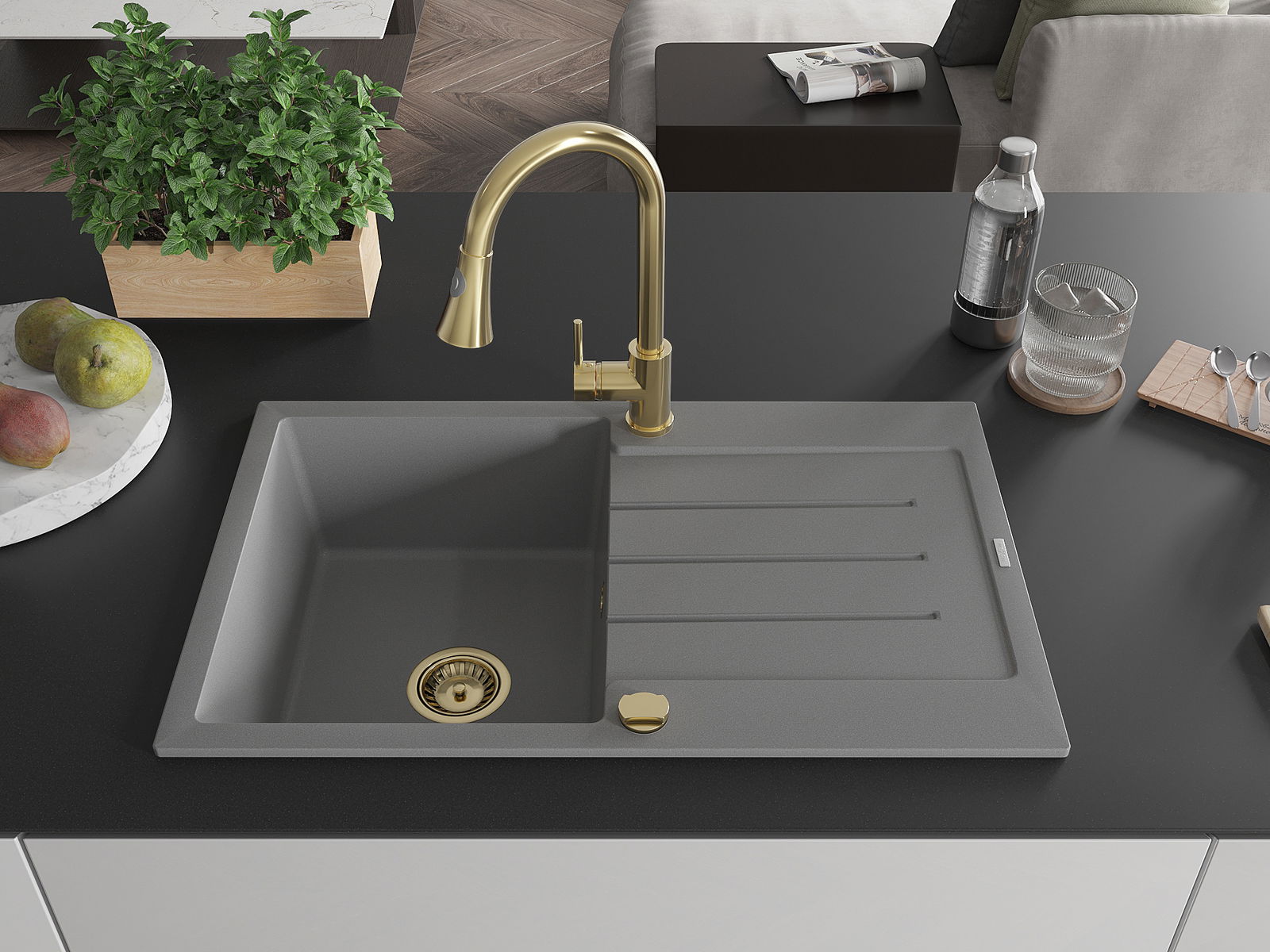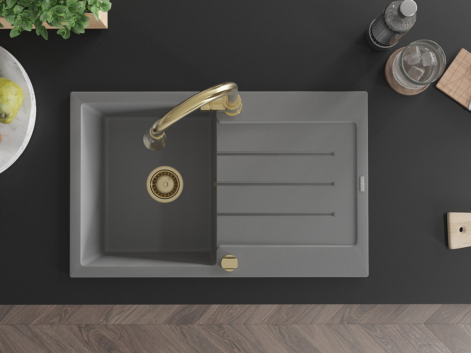 Mexen Bruno granito plautuvė vienos kameros su nusausintuvu ir virtuviniu maišytuvu Elia, pilka - 6513-71-670101-50