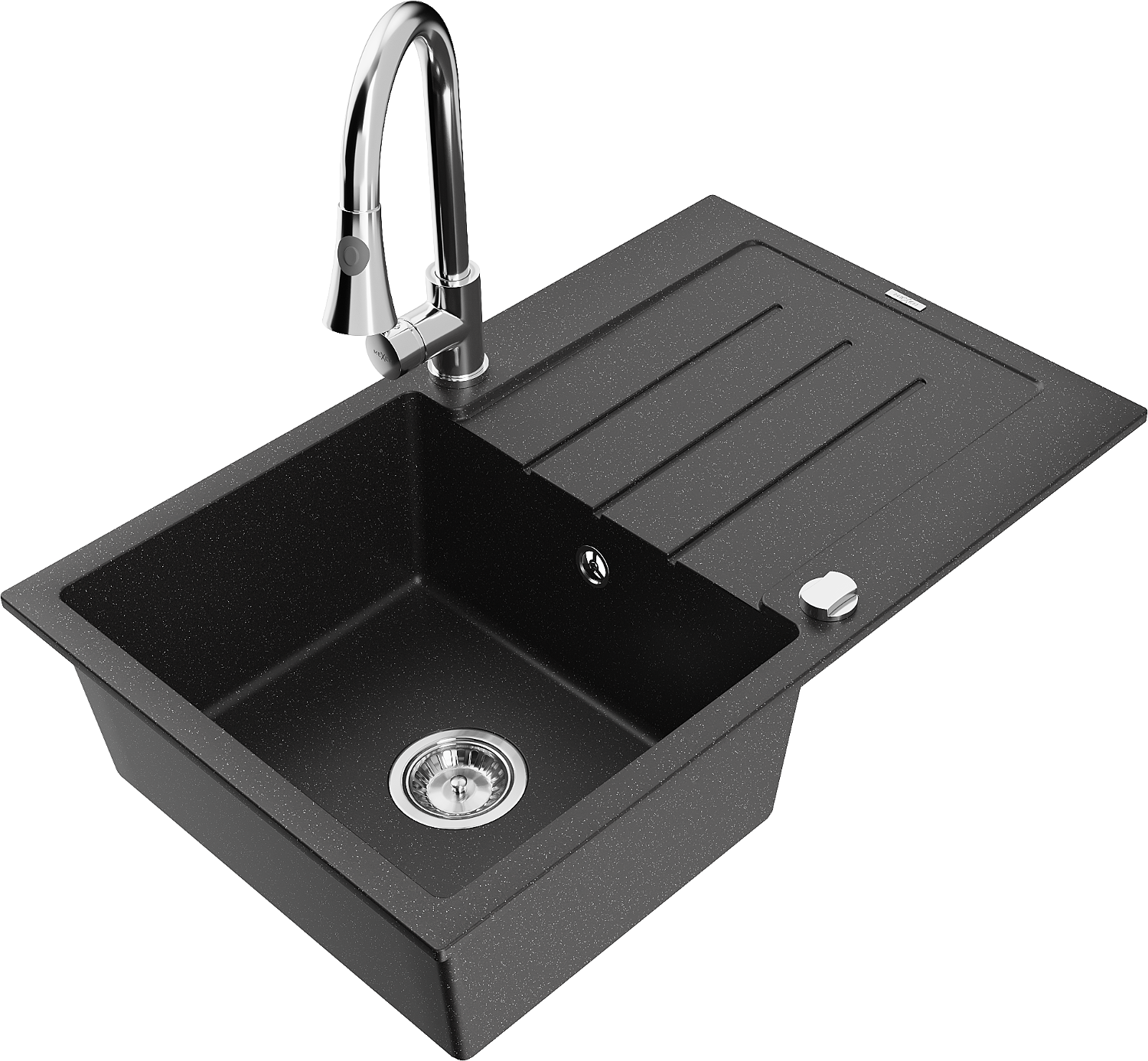 Mexen Bruno granito plautuvėle su vienu dubeniu, su nuvarvėjimo zona ir virtuviniu maišytuvu Elia, juoda/sidabro metalo
