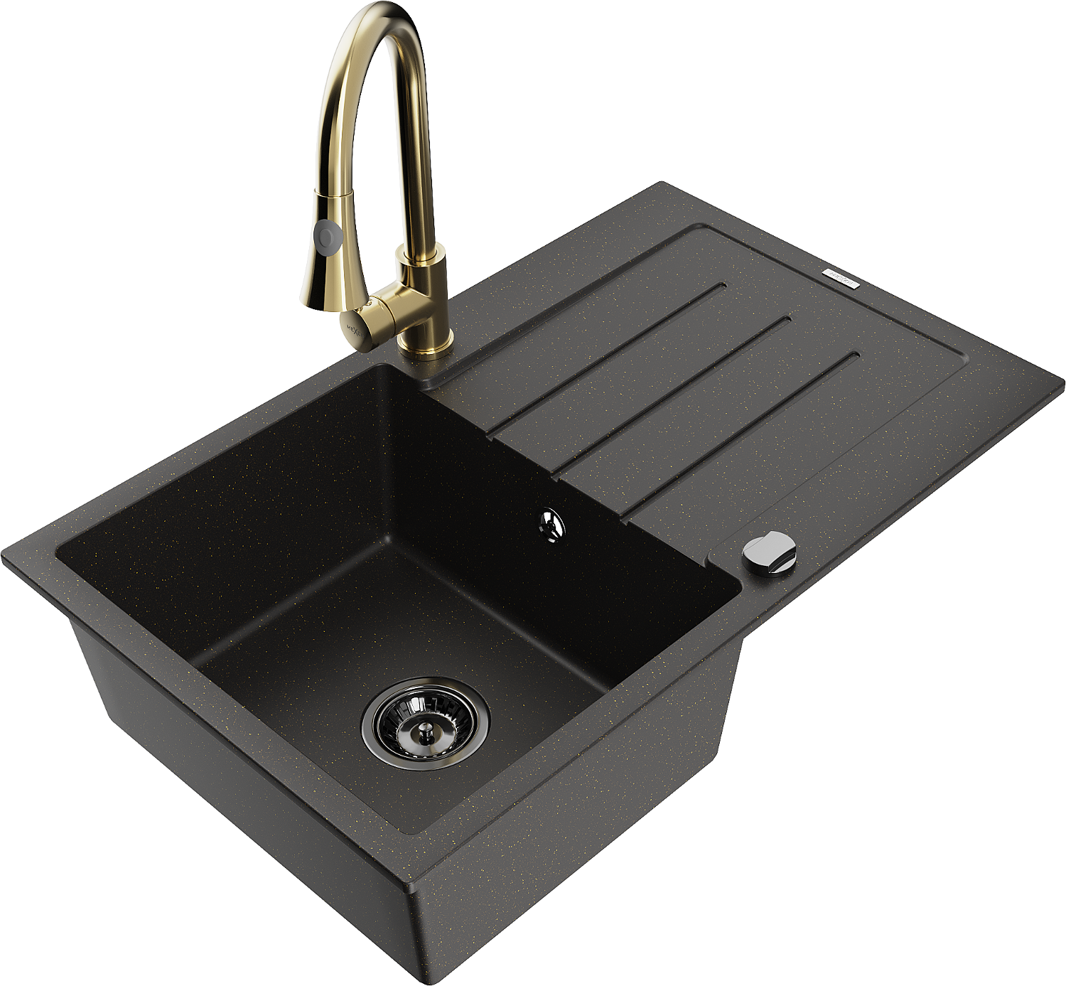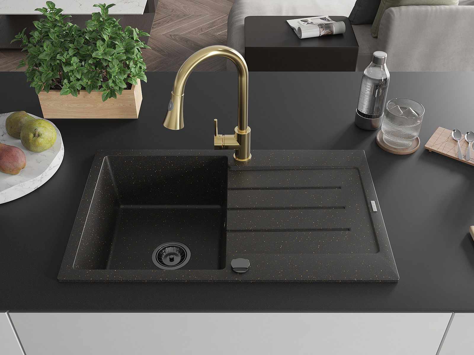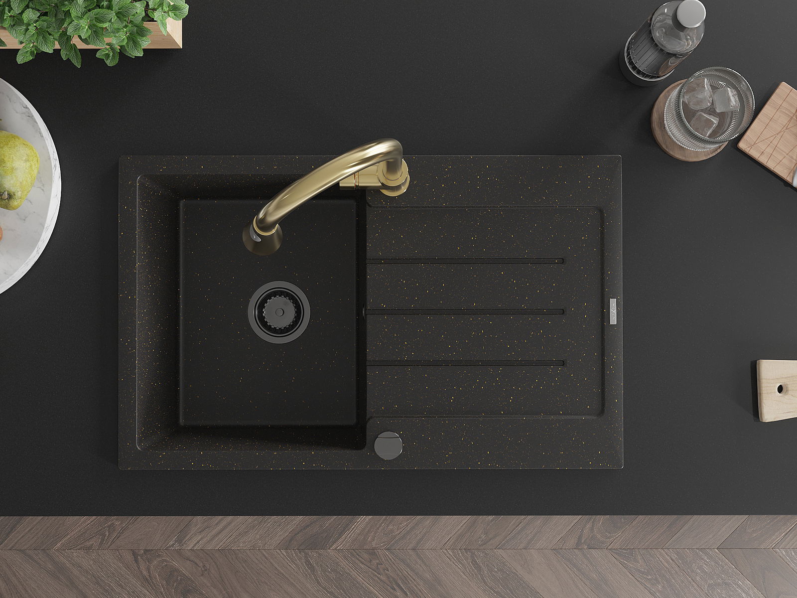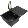 Mexen Bruno 1 kamerų granitinė kriauklė su nusausintoju ir virtuves maišytuvu Elia, juodas/auksinis metalikas