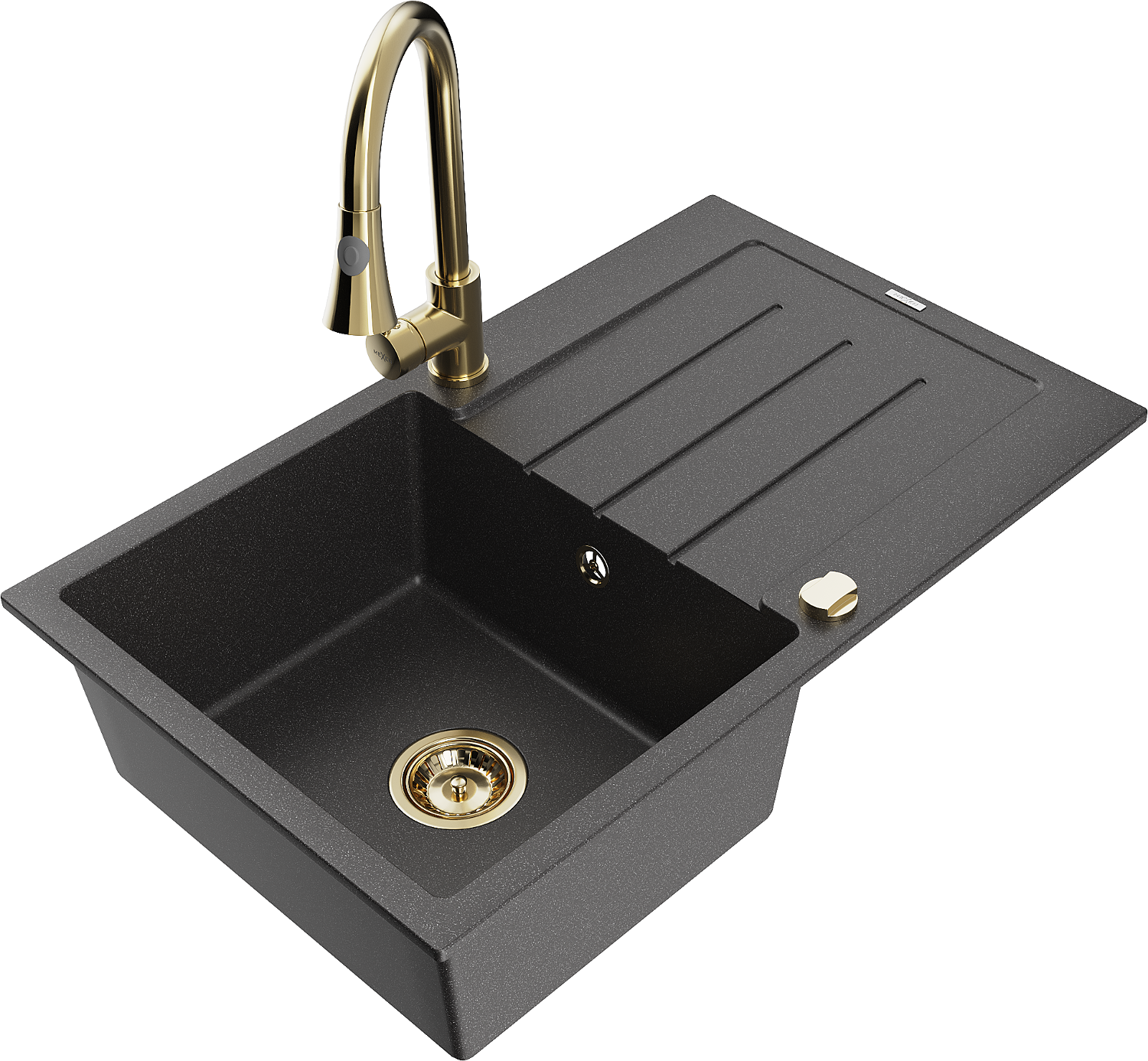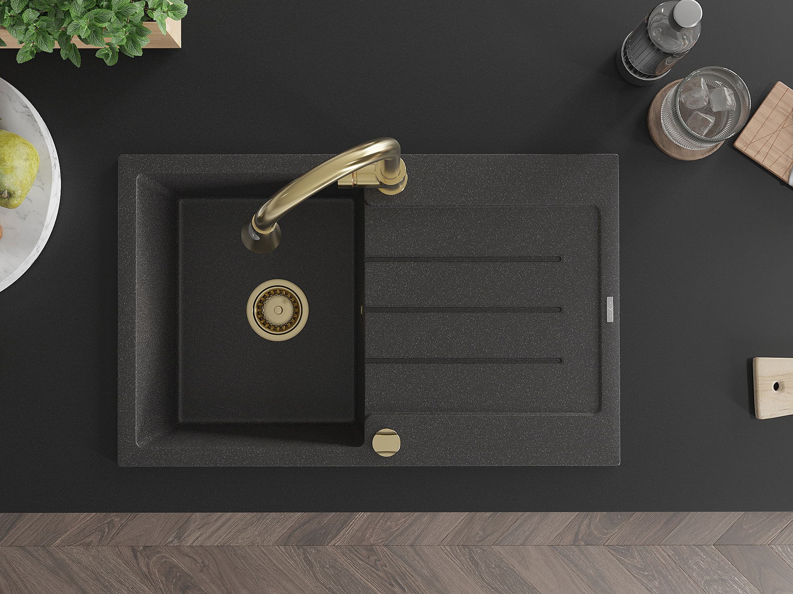 Mexen Bruno granitinė vienos kameros plautuvė su nusausintuvu ir virtuvės maišytuvu Elia, juodas su dėmėmis