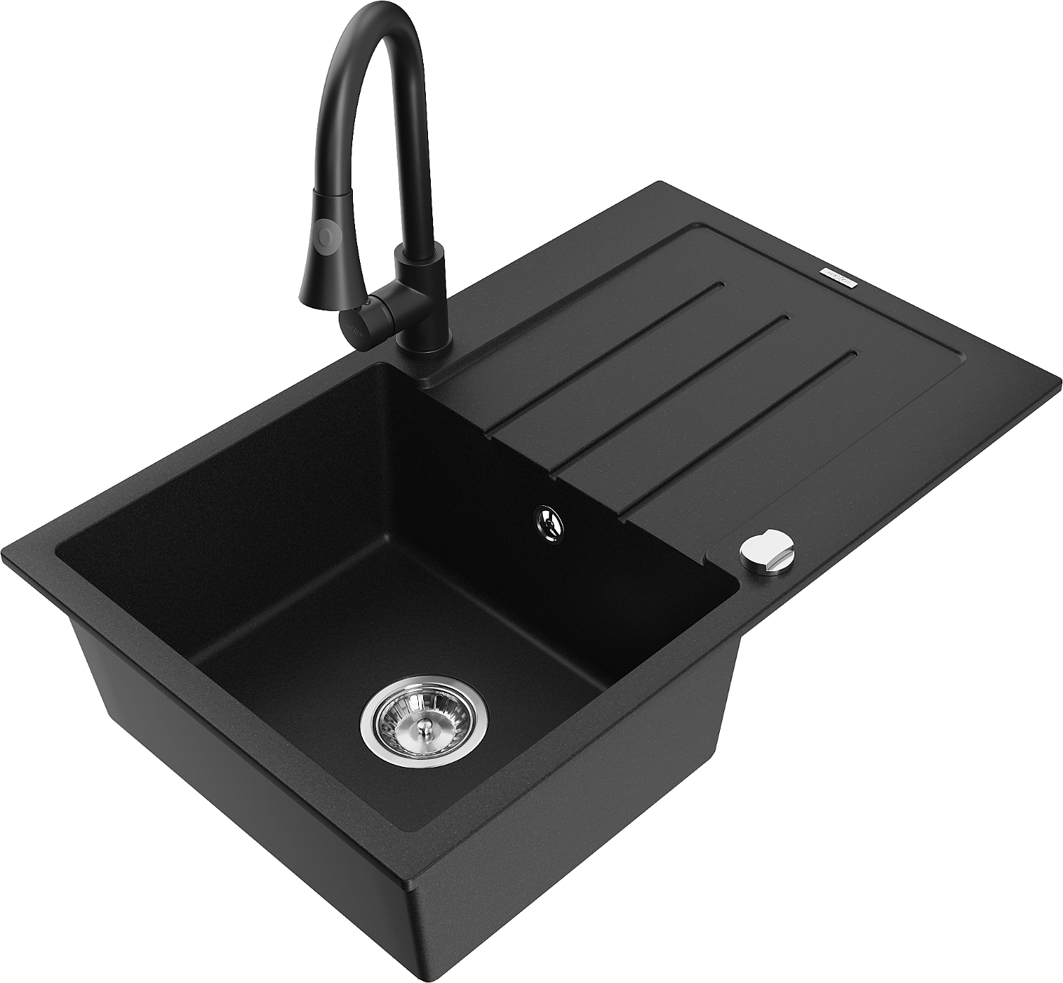 Mexen Bruno granitinis vienos kameros plautuvas su nusausintoju ir virtuviniu maišytuvu Elia, juodas - 6513-77-670101-70