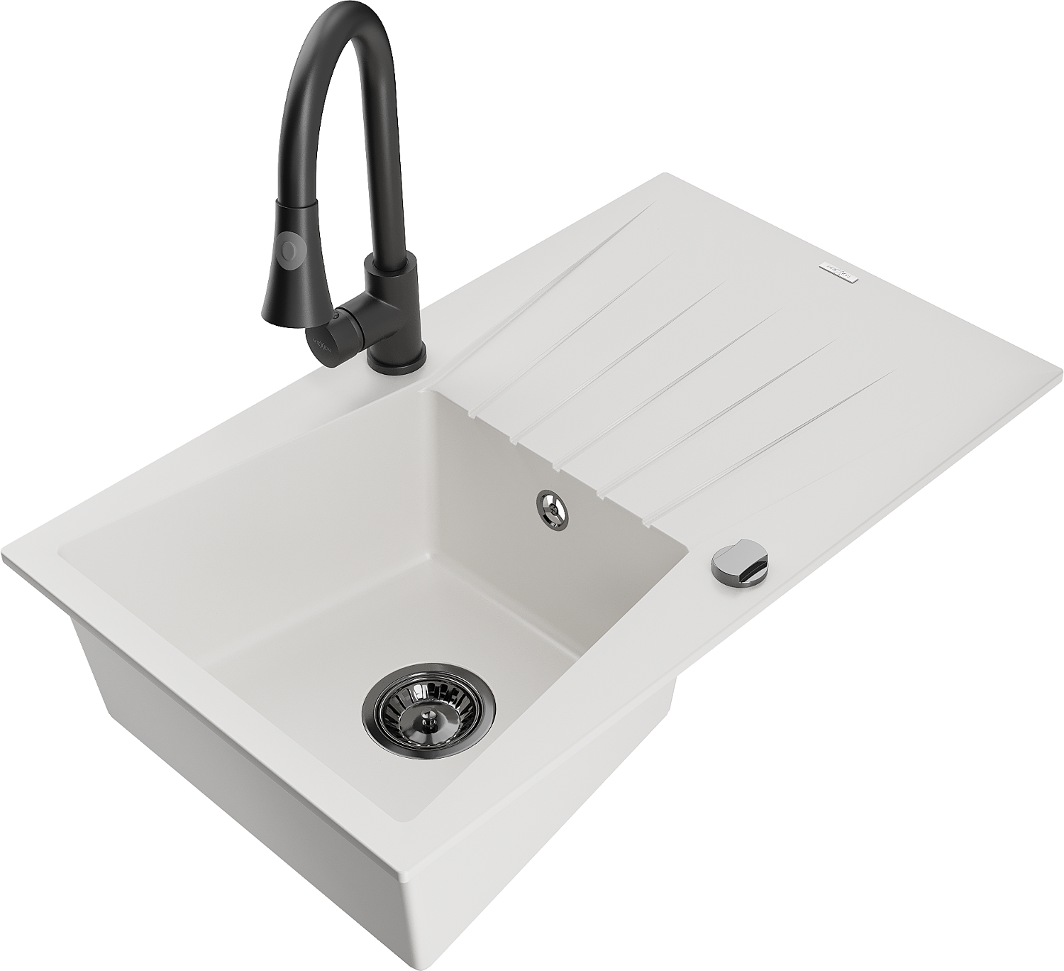 Mexen Cesar granitinė virtuvės plautuvė su nutekėjimo zonu ir virtuviniu maišytuvu Elia, balta - 6514-20-670101-70