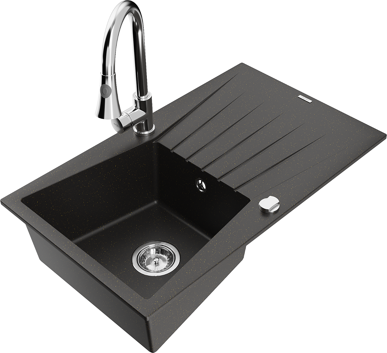 Mexen Cesar granitinis vienos plautuvės kriauklė su nutekėjimu ir virtuviniu baterija Elia, juoda/auksinis metalikas - 6514-75-?